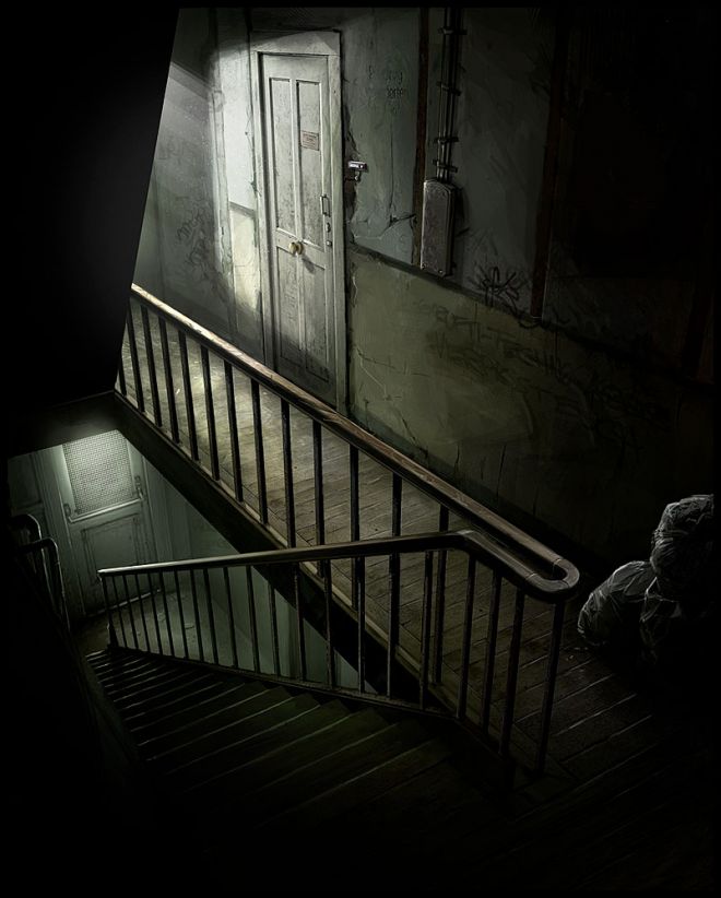 On continue avec un autre artiste, François Baranger, qui est l'auteur des multiples artworks des décors d'Heavy Rain, que l'on peut trouver d'ailleurs dans les bonus du jeu en les débloquant au fur et à mesure. Pour ceux qui n'ont pas fait le jeu et qui veulent le faire, ça peut gâcher la découverte des décors.
