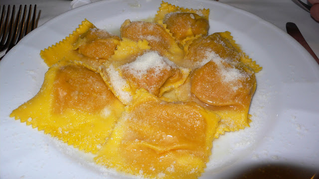 Ce sont des raviolis de potirons , un mélange délicat de potirons, d amande, de farine de châtaigne, de parmesan. C'est un délice sans nom et il mérite a lui tout seul le voyage jusqu'à Parme ^o^