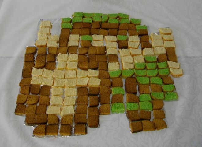 Première série: un Super Mario Bros à base de gateaux au chocolat, de financiers (patisserie aux amandes) et quatre-quart recouvert d'un glaçage chocolat blanc (coloré rose)