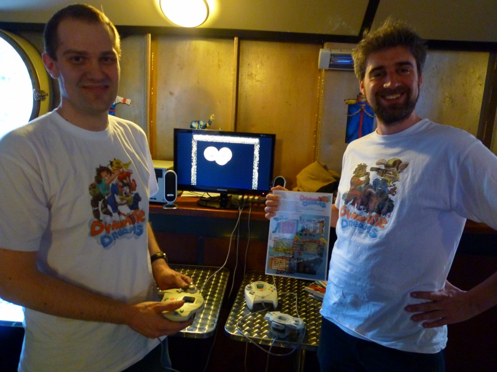 Là, se sont Julien Desquenne et Nicholas Pochet qui m'ont fait ce cadeau extraordinaire. Il faut dire que les deux gars sont en train de finaliser Dynamite Dreams un clone de Bomberman, lui aussi sur Dreamcast. Sa particularité ? Un des joueurs disparaît de façon aléatoire... Il est invisible pour vous, mais également pour les autres, donc la seule façon de suivre et controller votre personnage quand vous êtes invisible c'est de le suivre sur le petit écran LCD du VMU connecté sur votre manette.