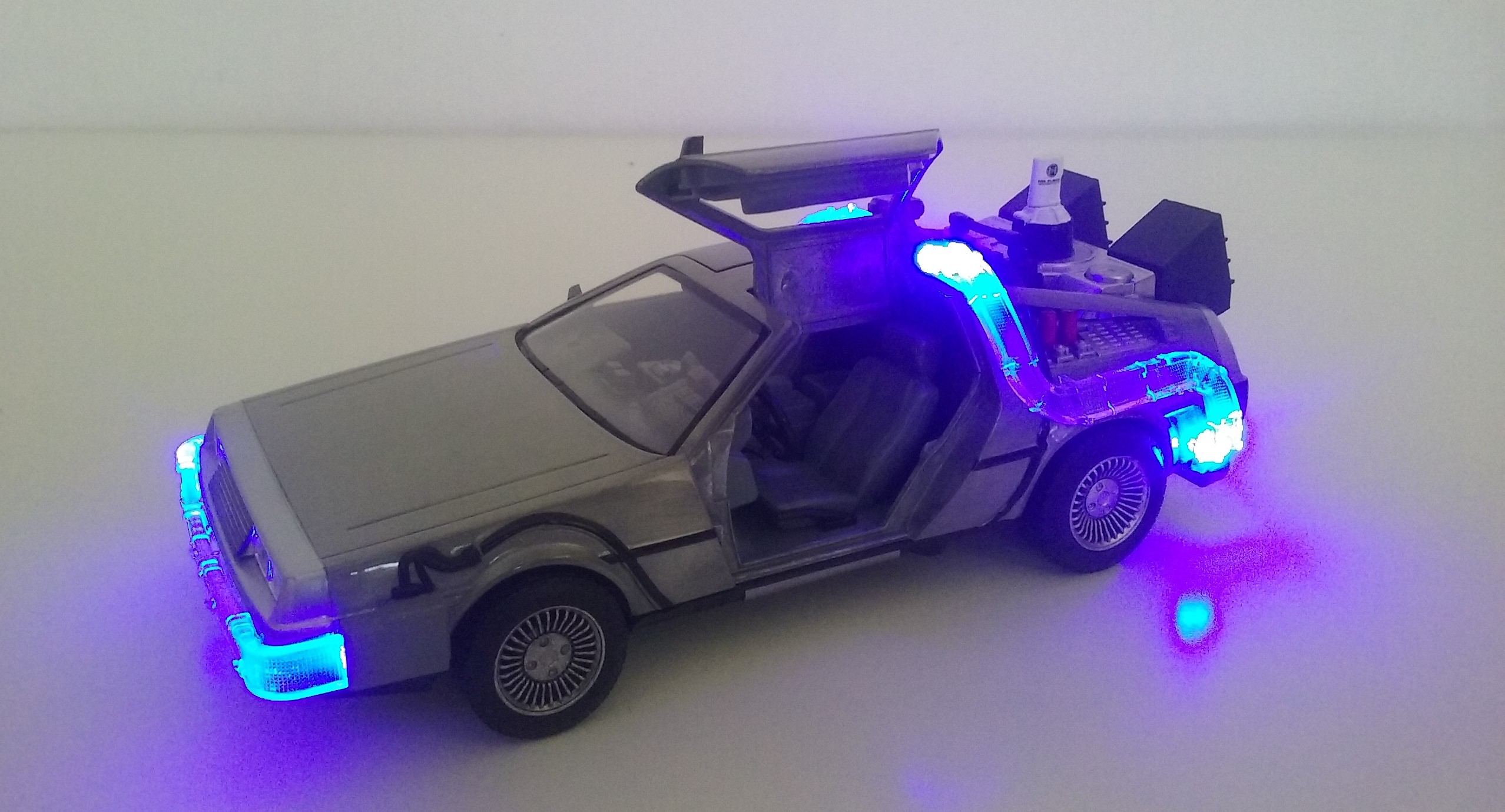 ...ainsi qu'une DeLorean avec option illumination (modèle du deuxième film, avec roues en mode vol disponible)