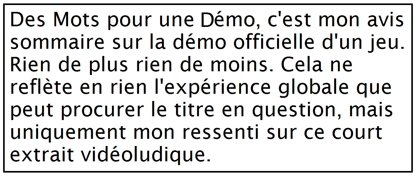 - Rien que sur la démo, de grosses tares techniques qui n’augurent rien de bon pour la version complète (un menu non achevé, un écran de pause qui réapparaît inopinément 1min30 après l’avoir quitté, quelques bugs de sons…)