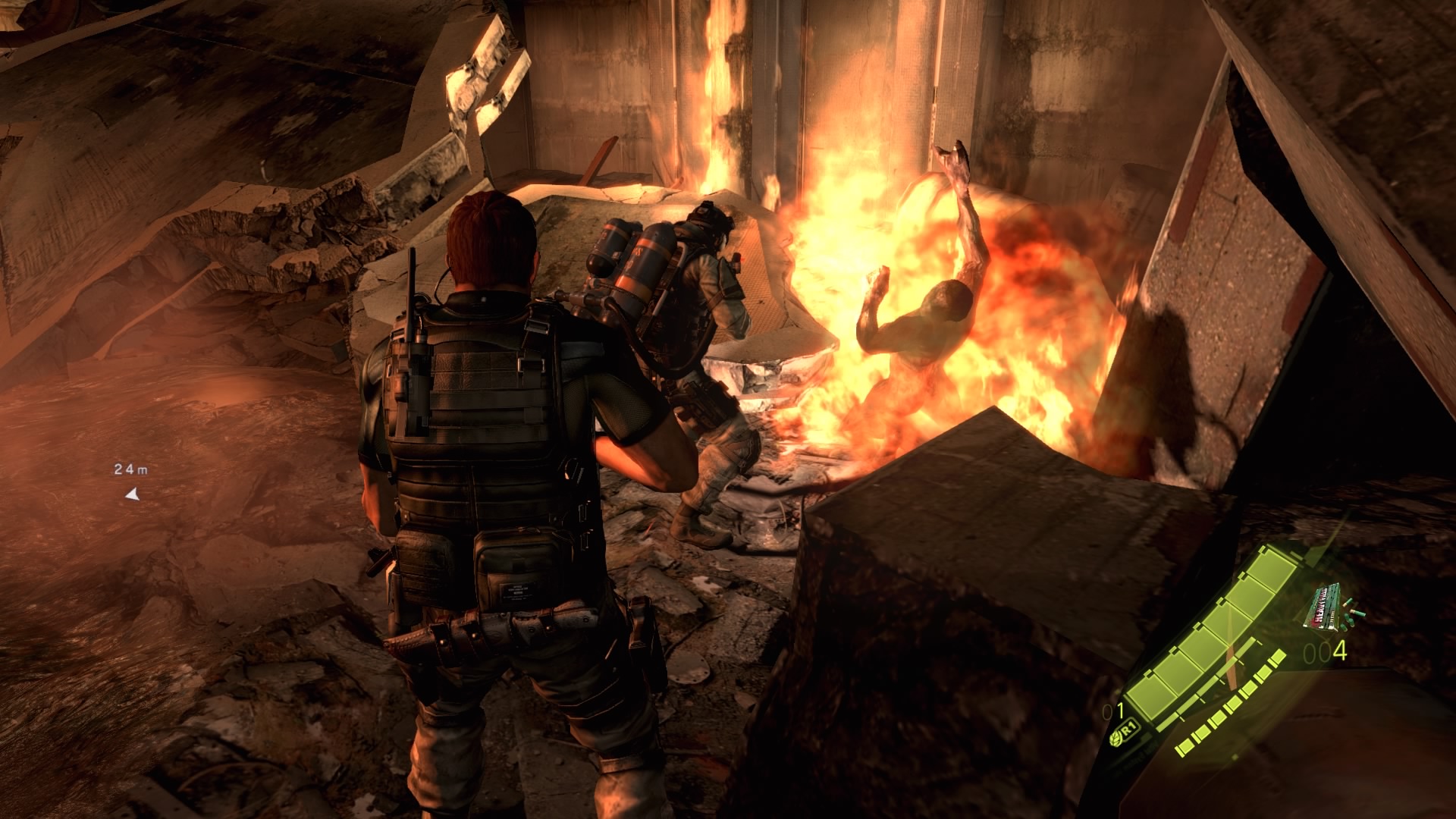 La partie Chris Redfield, honteusement calquée sur un Call of lambda est l’antithèse de ce que doit être un Resident Evil. On croit réellement s’être planté de jeu quand on lance çà. Du Pan Pan Boum Boum au ras des pâquerettes (pour ne pas dire débile), noyé dans une ambiance militaro-guerrière américaine à gerber, c’est tout simplement une honte absolue. Je ne polémiquerai même pas sur le scénario totalement crétin de cette partie, ni fait ni à faire, qui voit un Chris perdre la mémoire mais pas tout à fait mais quand même en grande partie (ça n’a ni queue ni tête, c’est le cas de le dire). La cinématique d’introduction dans le bar est véritablement hilarante de niaiserie et de loyauté exacerbée jusqu’à l’absurde. C’est nul de chez nul, cliché jusqu’à la moelle…on se rapproche vraiment de l’ambiance série Z qui se dégageait du tout premier épisode, avec les acteurs dans la séquence d’ouverture méga-ringarde et fauchée. Le fond de poubelle de la franchise.
