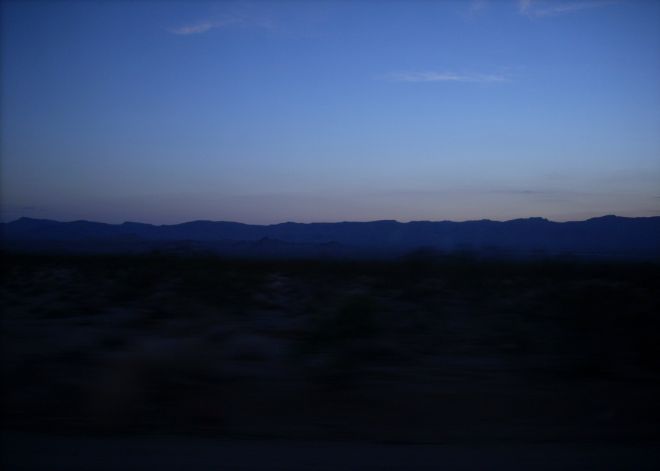 La nuit est tombée alors que nous roulons depuis des heures au milieu du désert. L'obscurité est totale. Les phares de notre Buick éclairant le bitume apportent un semblant de lumière dans ces ténèbres interminables. Enfin notre route en rejoint une autre, un peu plus fréquentée. Puis très vite on se retrouve sur une deux-voies, où la circulation semble s'agitée. Alors on scrute l'horizon, à la recherche de cette folie faite ville. On croit l'apercevoir derrière chaque rocher, derrière chaque butte. Mais non. Il ne s'agit que de quelques constructions éparses, d'enseignes décrépies ou d'îlots d'habitations plantés dans le sable infini. Puis en plein de milieu de nulle part, un carrefour. Un vrai de vrai. Avec feux tricolores des quatres cotés (mais pas de passages piétons). Dès qu'un feu passe au vert, un torrent de véhicules se déverse sur cette désormais quatres-voies. On regarde çà d'un oeil mi-amusé mi-abasourdi. Il n'y a pas 20 minutes nous étions seuls au monde en plein No Man's Land. On reprends notre route, voiture parmi des centaines d'autres. Il y a un désert à gauche. Il y a un désert à droite. Surréaliste. Je crois être en plein rêve.