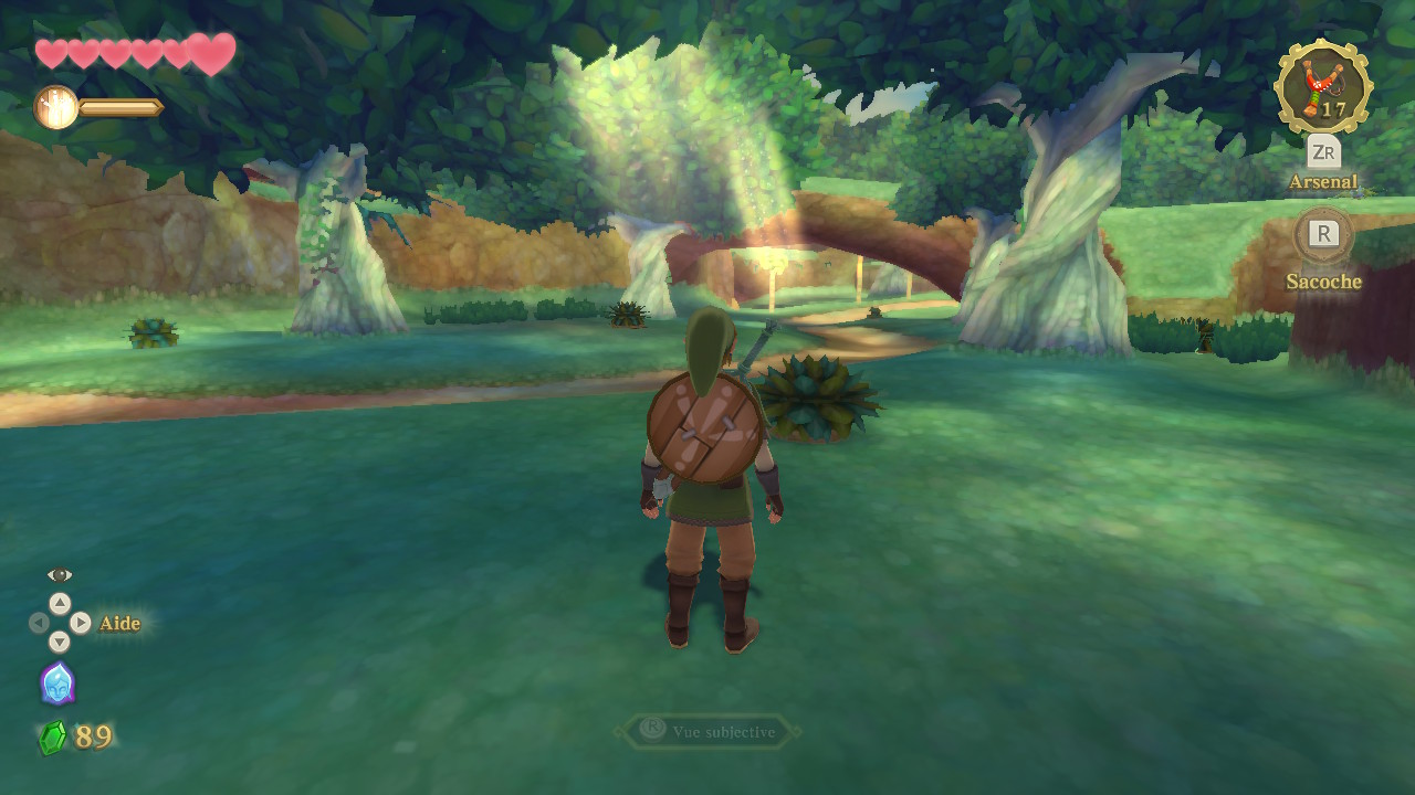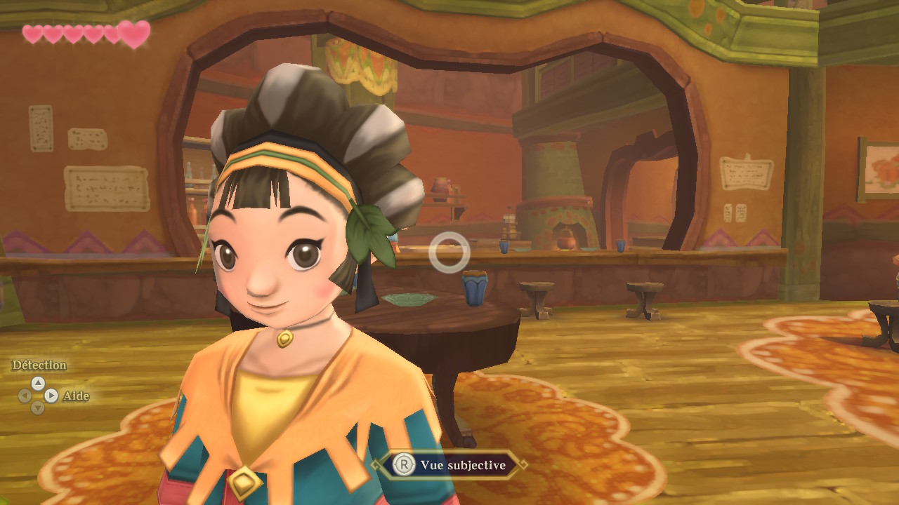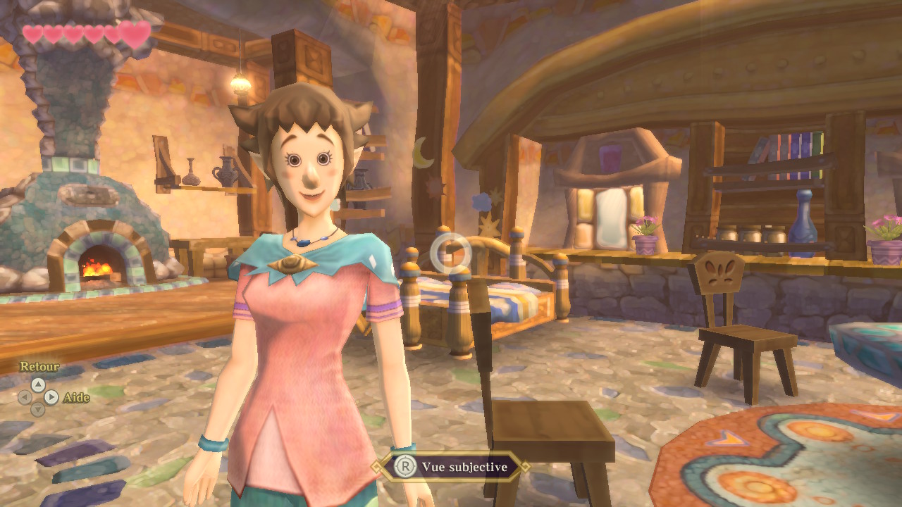Mais le personnage central de ce périple reste Fay, l’âme de l’épée légendaire qui nous accompagnera tout du long pour braver les dangers. La Mistinguette, sorte de ballerine robotique un brin désuète, possède quelques fonctions bien utile. En en haut de la liste la détection qui nous permettra de ‘cibler’ un objet ou ustensile précis afin de ne pas chercher indéfiniment dans les zones à explorer. Cette fonctionnalité se passera en vue à la première personne car oui, la vue subjective est disponible à tout moment et même si sa maniabilité n’est pas des plus aisée, elle se révélera à maintes occasions bien pratique. Miss Robot pourra également distiller indices, recommandations et précieux conseils à notre icône vidéoludique au vert bonnet. Paraît-il que ses dialogues furent amoindris dans cette version HD et qu’elle intervient donc moins souvent. C’est possible, je n’ai pas grand souvenir qu’elle fut très présente lors de ma partie sur Wii il y a des années. En tout cas on peut la consulter quand bon nous semble en l’invoquant par une pression sur la croix multi-directionnelle (et par conséquent on peut ne pas l’invoquer également…).