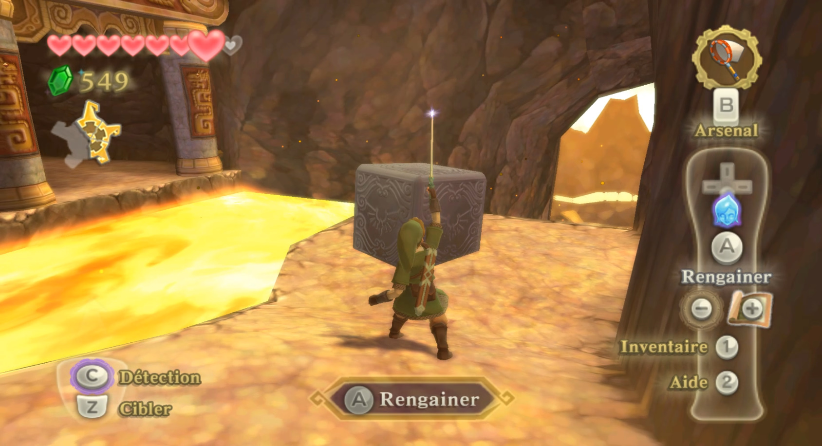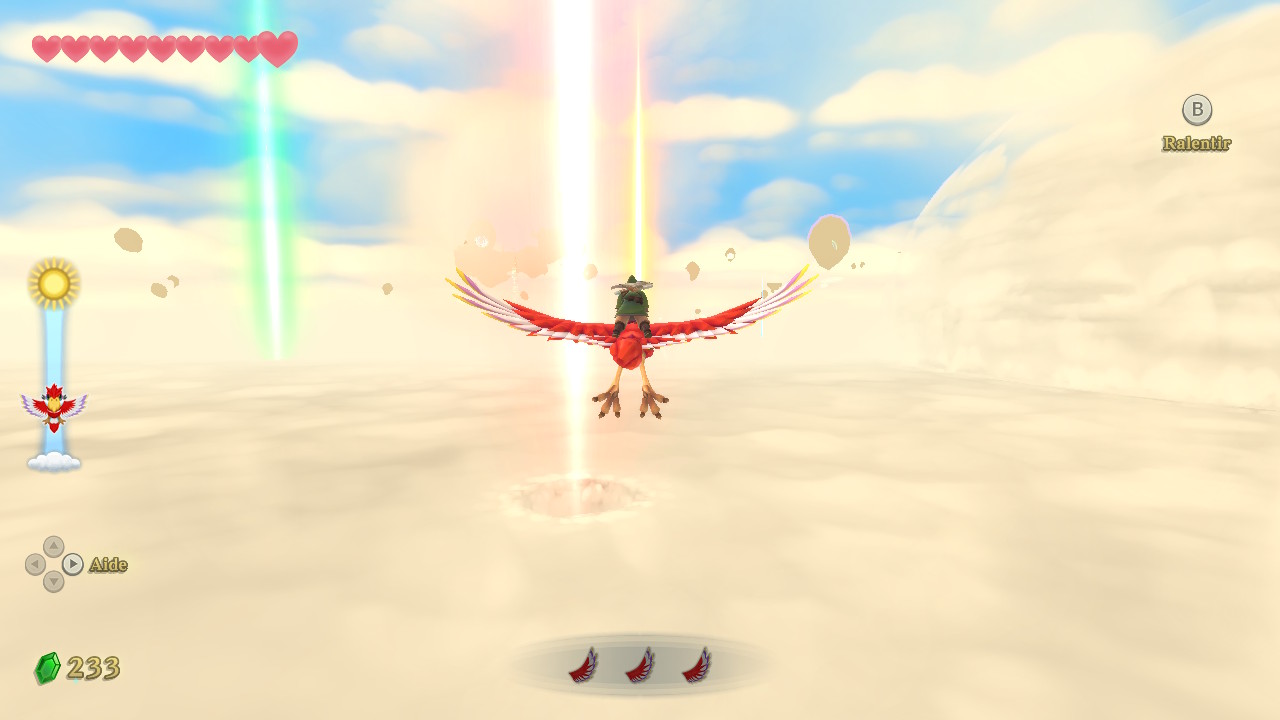 Et on en vient à l’arsenal de Link, passage obligé de tout les Zelda. Ici on trouvera du classique comme le lance-pierre, l’arc (disponible très tard dans le jeu) ou les éternelles bombes mais aussi des spécificités dont la plus marquante restera le scarabée, sorte de drone ultra pratique pour repérer les lieux. Le fouet sera également de la partie ainsi que la Jarre Magique, sorte d’aspirateur infini (en fait il ‘expire’, mais peu importe). Bien entendu tout cela à la base était conçu pour la capture de mouvement à la Wiimote, et bien entendu c’était un cauchemar de jouabilité. Le rendu à la manette est moins casse-noisette malgré quelques anicroches parfois.
