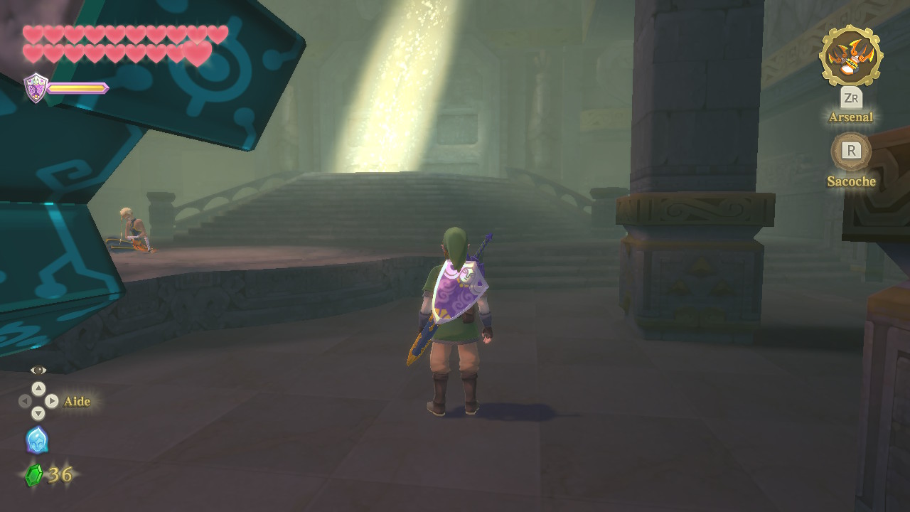 Abordons maintenant la jouabilité et les systèmes de jeu, ce qui s’annonce un poil fastidieux mais allons-y gaiement. On commencera par l’essentiel, à savoir le système de combat. Et il y a déjà beaucoup à dire. Sachez déjà que je joue sur Switch Lite, et donc absolument sans Motion Gaming. Mais le jeu ayant été conçu dans cette optique et seulement celle-ci, il à bien fallu ruser pour retranscrire cette maniabilité à une ‘manette’. Et c’est donc via les sticks analogiques que ce fera cette transition. Le droit servira pour l’épée et le ‘clic gauche’ s’usitera pour brandir son bouclier. Donc – et c’est un élément IMPORTANT – il n’y a pas de caméra libre de base dans Skyward Sword HD ! Pour l’enclencher, il vous faut maintenir une gâchette, ce qui activera la seconde fonction de l’analogique droit et vous pourrez alors avoir accès à la vue libre. Ou alors il y a la possibilité d’activer la ‘caméra gyroscopique’, ce qui est cool 5 minutes mais qui confine rapidement au gerbotron impraticable. Mais je m’éloigne grandement du mode combat. À la moindre pichenette sur le stick droit Link dégaine donc son épée et il faut une force mentale pour appréhender le fait de ne pas manipuler le bitoniau à tout-va. Une fois cette gymnastique des doigts acquise, on parvient à maîtriser notre bonhomme assez aisément mais cela reste particulier. D’autant plus particulier que ce système s’adapte aux ennemis qu’il faudra atteindre en balayant son arme dans un axe précis ou bien en cliquant pour porter un coup d’estoc. En effet ceux-ci auront une faiblesse dans leur défense qui indiquera dans quel sens manipuler l’analogique pour les atteindre. J’ai conscience que ce n’est pas simple à visualiser mais pensez toujours à l’origine de captation de mouvement du soft pour tenter de vous faire une idée. Encore une fois c’est une gymnastique mentale mais une fois dans le pli les attaques ciblées deviennent quasiment automatique. On ajoute à cela les attaques chargées : la classique attaque tournoyante à laquelle s’ajoute la charge céleste. En maintenant son épée pointée vers le ciel, elle se charge d’une aura divine qui octroie alors une charge d’énergie qui peut être libérée en portant un coup (astuce : avec un coup d’estoc, on envoie une boule d’énergie !).