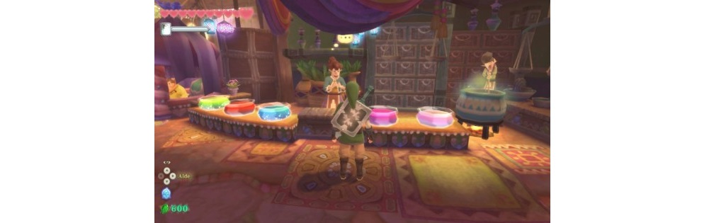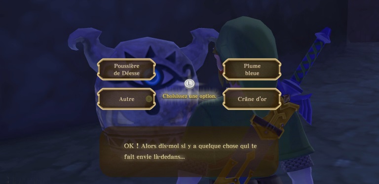 Car oui il existe aussi la possibilité de crafting ou disons plutôt pour être plus juste d’amélioration (Link ne fabrique rien). Qu’il s’agisse des potions, des boucliers ou de son arsenal guerrier, tout cela peut voir ses capacités augmenter à la condition que le lutin ait suffisamment d’ingrédient sur lui pour le permettre (plus le coût de la main-d’œuvre de l’artisan pratiquant le travail…). Il s’agira de dénicher des reliques (crânes, grigris, minéral et autres) ou bien des insectes qui permettront aux ateliers de s’échanger contre du meilleur matos. Obtenir certains de ces ingrédients peut se révéler très rébarbatif mais c’est une étape quasiment indispensable si on veut posséder un bouclier à peu près potable. Les potions ultimes ne sont pas mal non plus.