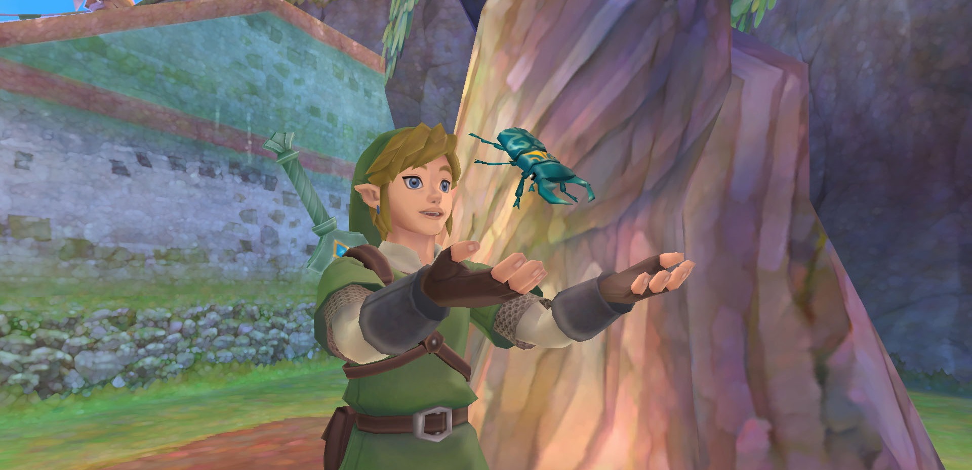 Le contraste est frappant entre l’épisode précédent (Twilight Princess) qui voyait notre gars aux oreilles pointues être un travailleur des champs, à s’occuper des bêtes et surtout sans grande ambition héroïque. Celui-ci est à l’exact opposé : il vit en plein ciel et rêve de devenir chevalier. Le lieu même dégage une atmosphère très singulière, onirique avec ses petits îlots flottants surréalistes et ses tons pastel enchanteurs. Les graphismes se veulent très doux, très cocooning si je peux me permettre cet anglicisme. Cela se reflète en premier lieu dans le character-design, avec ses personnages tout en rondeur, aux visages à la fois très simple et très expressifs, à la limite du cartoon parfois.