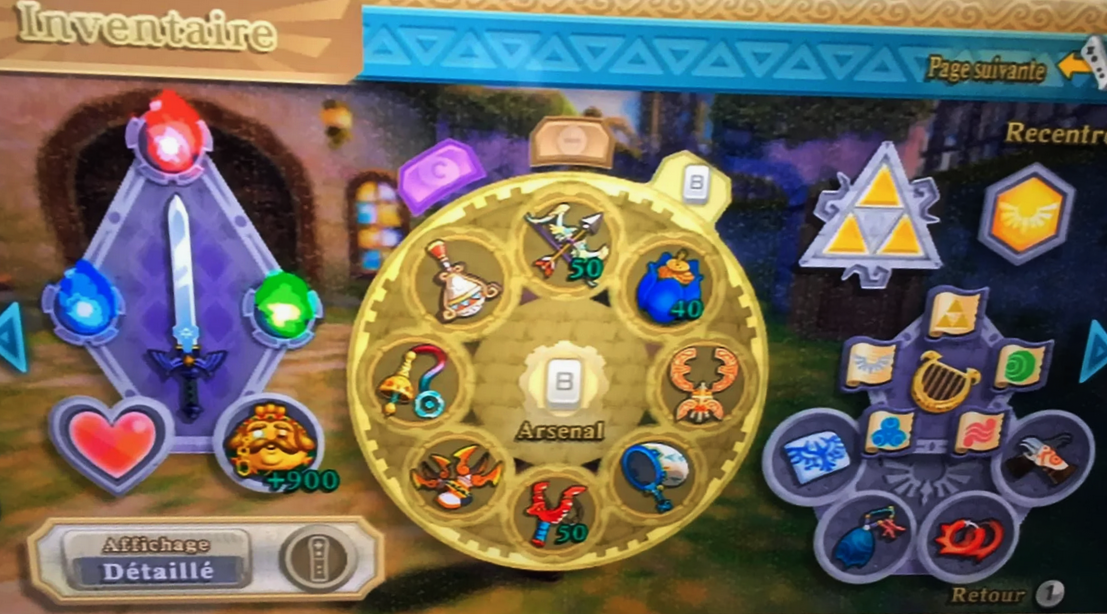 La sacoche. Un système qui fait que Link ne peut transporter que quelques bricoles avec lui. Ne possédant au départ que quatre emplacements, elle se trouve vite remplie, sachant qu’en plus le bouclier y occupe une place. C’est là que se rangeront les médaillons, les bouteilles, les sacs de graines en surplus ou les carquois améliorés. C’est un principe très contraignant - pour ne pas dire extrêmement déplaisant - même si on peut augmenter sa capacité à huit emplacements, qui se remplissent tout aussi vite. Les médaillons sont des bonus qui octroient une aide à Link (plus de rubis trouvés, plus de cœur trouvés etc…). On les trouve au hasard de nos pérégrinations et peuvent s’avérer fort utiles.