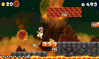 - Les blocs "?" volants du premier New Super Mario Bros sont de retour. UP : contrairement à ce dernier, ce sont des blocs dorés qui se greffent sur la tête vous gratifiant de pièces dont le débit dépend de votre vitesse de déplacement. Il vous offre aussi une invincibilité temporaire.
