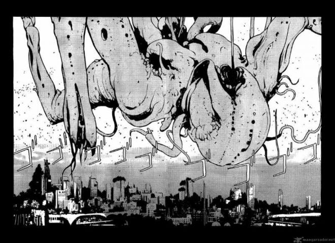 Le problème de la nourriture est donc résolu de façon radicale par Tsutomu Nihei qui n'hésite pas à faire des humains des sujets OGM. Là encore comme pour les soeurs Honoka, la chose est normale et n'appelle pas à des craintes spécifiques, alors que dans Soylent Green là encore, la perte de la nourriture est vécue comme une reniement de ce qui contribue à constituer notre l'humanité.