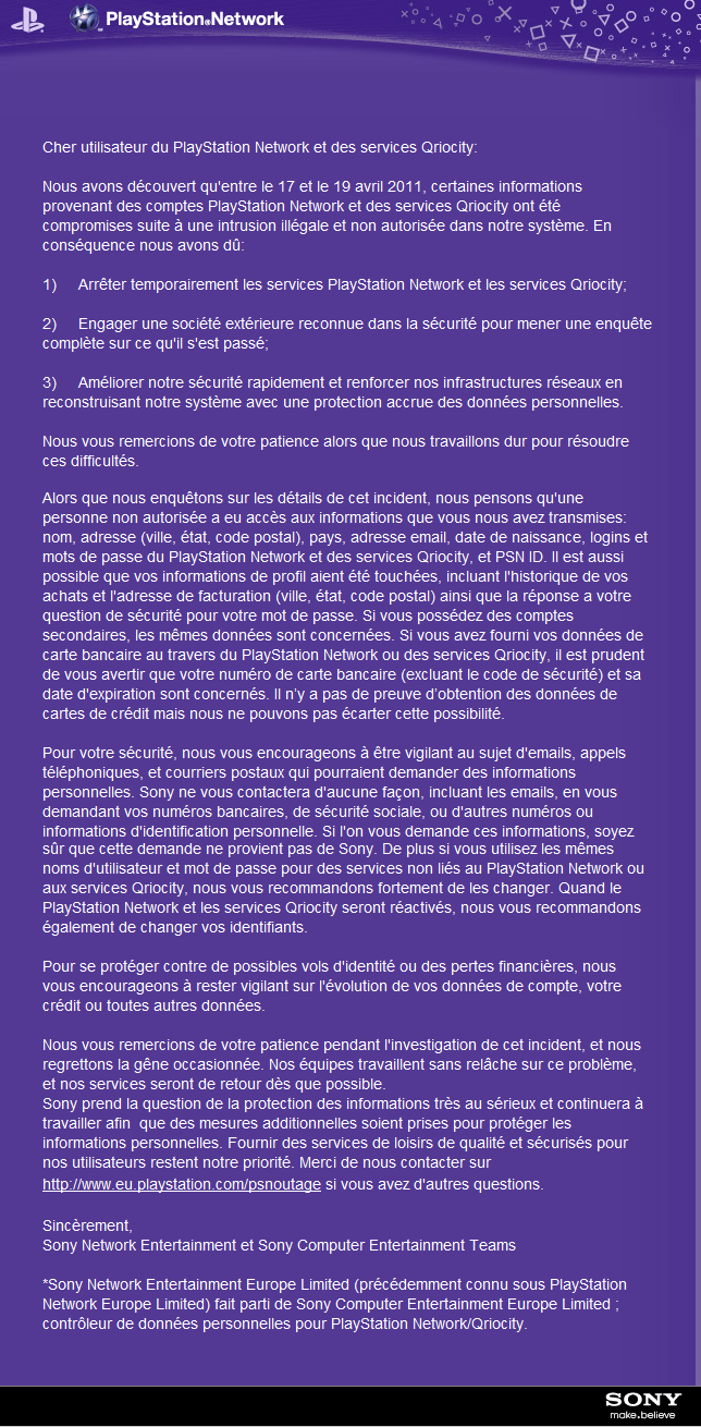 Je sais pas pour vous mais c'est seulement aujourd'hui que j'ai reçut un mail pour m'avertir des incidents du PSN. Mieux vaut tard que jamais comme on dit... Mais etant donné les risques que cela implique je trouve que ça fait un peu "tard". Je trouve que Sony n'a jamais été bon en com pour le marketing mais apparament c'est pareil pour ce genre probleme.