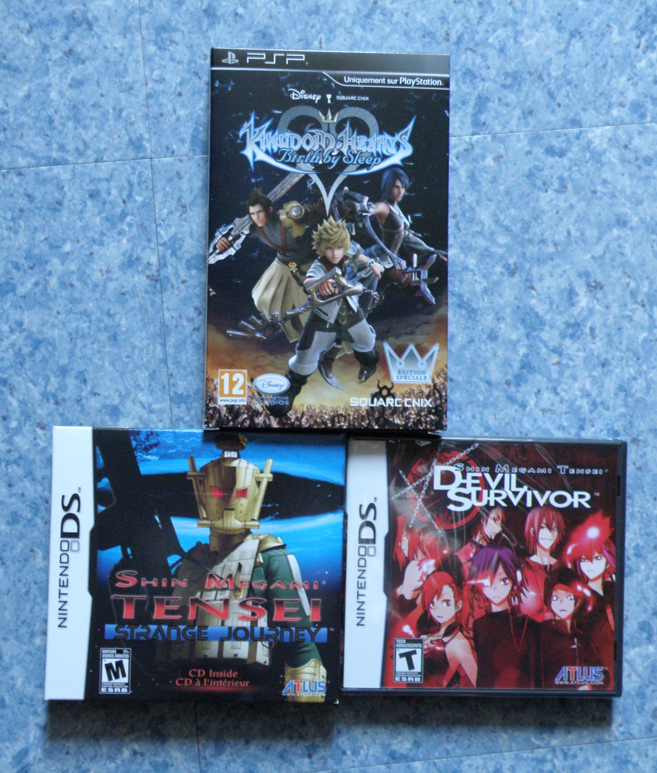 Mes deux Shin Megami Tensei DS tout neuf fraichement arrivé. Ma joie est encore décuplé lorsque je découvre que Strange Journey est vendu avec un emballage carton (difficile à voir sur l'image) absolument superbe. Je n'ose à peine l'ouvrir tellement que c'est beau.