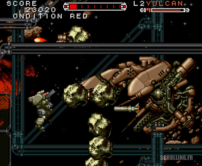 Ainsi chaque mission demande à être abordé de façon réfléchie car les niveaux sont immenses et labyrinthique. Elle peuvent être abordées de plusieurs façons mais la meilleure option reste de les explorer de fond en comble afin de récupérer des armes bonus ou des P-up pour augmenter votre puissance de feu. Au nombre de deux initialement (vulcain & punch) il est possible de mettre la main sur deux armes supplémentaires à savoir le missile shot et le laser. "Upgrader" et utiliser intelligemment ces armes sont l'autre clé du succès d'une mission. Point intéressant certaines d'entre elles proposent de remplir des objectifs sous peine de Game over ou influent directement sur la fin du jeu.