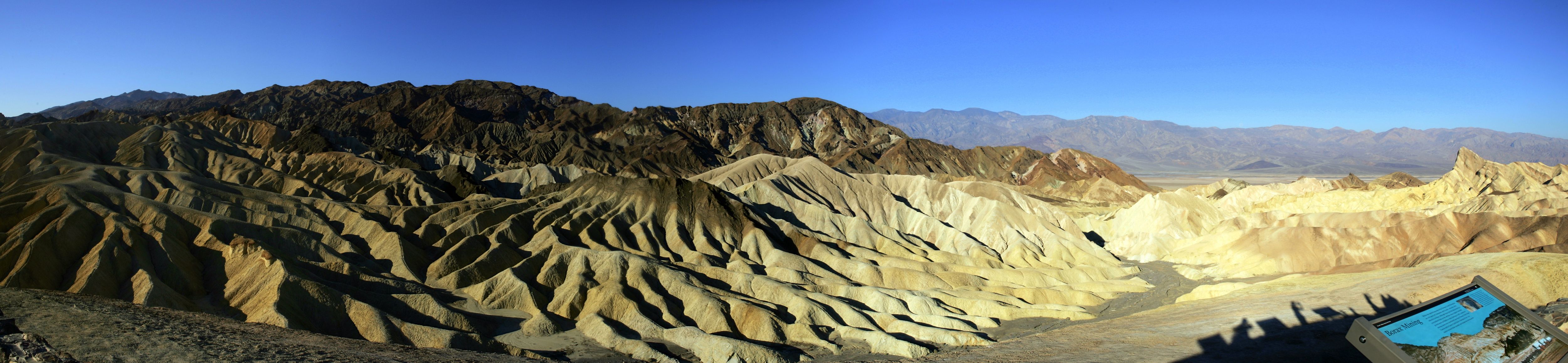 Ayant eu un peu de temps devant moi, je me suis amusé à fusionner des clichés pris en rafale lors d'un petit passage à Zabriskie Point, dans la fameuse vallée de la mort à la frontière du Nevada et de la Californie. Un premier cliché qui en annonce d'autres, puisque je consacrerai bientôt un post tout particulier à ce lieu incroyable, qui a alimenté l'imaginaire de l'industrie hollywoodienne de ses débuts jusqu'à nos jours. Je vous encourage au passage à cliquer sur le pano pour en profiter en haute définition...