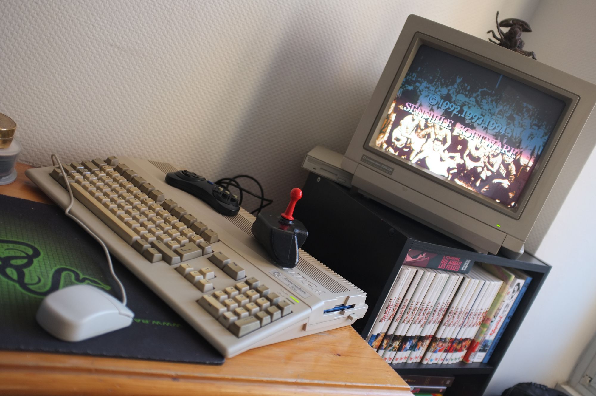 Depuis vendredi soir, je m'emploie à choyer la machine. Je lui ai donné un petit coup de polish pour la nettoyer, c'était effectivement nécessaire. Depuis, je teste le software. Certaines disquettes ont rendu l'âme, d'autres fonctionnent à merveille. Suffisamment en tout cas pour me convaincre une nouvelle fois du statut unique de cette machine : animation sans faille de la 2D des jeux de plate-forme, quadruple canal huit bits sonore qui envoie du bois encore mieux que dans mes souvenirs... L'A500 est définitivement une machine à part, et trouve toute sa place aux côtés du reste de ma collection. Mon unique ordinateur vintage, avec un vieil Atari 800 XL qui m'a également donné pas mal de bonheur quand j'étais gosse. La réconciliation, dans mon bureau, n'est pas un vain mot...