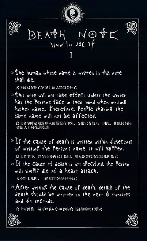 Remettons les choses dans leur contexte. Yagami Raito, ou Raito Yagami dans notre sens, trouve un jour sur la pelouse de son lycée un mystérieux cahier. Sur celui-ci sont écris des notes qui énumèrent ses pouvoirs. Il semblerait donc que le cahier permette à son propriétaire de tuer un autre être en écrivant simplement son nom et la cause de sa mort sur une des pages. Si aucune cause n'est précisée, la victime décédera d'une crise cardiaque. Ce simple postulat offrait une palette de possibilités gigantesque qui est parfaitement utilisée par le génial Tsugumi Ôba.