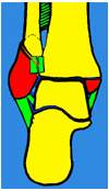 1 : tibia (qui forme la malléole interne) ; 2 : fibula (ex péroné, qui forme la malléole externe) ; 3 : talus ; 4 : calcanéum (os du talon) ; en vert : ligament fibulo-tibial postérieur.