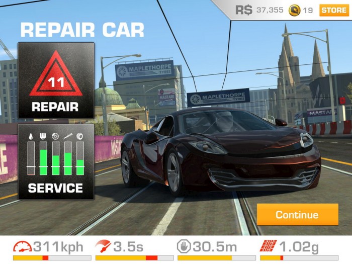 Les achats in-app sont ici plutôt pénalisants si l'on prend parti de ne pas les faire du fait qu'il les ont intégré aux entretiens et réparations des voitures. Chaque course que l'on fait dégrade la voiture sur plusieurs plans (huile, moteur, pneux) et après quelques courses il va falloir faire une entretien qui coute de l'argent virtuel que l'on a gagné dans le jeu. En sois, un bon système. Par contre il faut également noter qu'un tel entretien prend du temps. Selons le nombre et l'importance des entretiens vous perdez la disponibilité de votre voiture pendant quelques minutes, ou quelques heures. Rajoutez à cela que les voitures peuvent encourir des dégats lors d'une course et après chaque course il faut également réparer votre voiture selons votre style de conduite plus au moins brute. Le jeu permet "d'acheter de l'argent ingame" et permet de payer en monnaie sonnante et trébuchante pour qu'un timer de réparation disparaisse. Le soucis est que au début du jeu, il est très difficile de pouvoir faire plusieures courses d'affilée sans devoir attendre quelques minutes, voir quelques heures entre deux courses. Une fois que l'on dispose d'un parc de voitures plus conséquent, cela devient moins un soucis vu que l'on jouera avec une voiture tandis que l'autre se fait réparer. Certains rageront, d'autres pas. Moi, je me suis dit que je suis prêt à payer pour la qualité de ce jeu environs 20 EUR et c'est ce que j'ai fait au début afin d'obtenir maintenant au total 5 voitures dans différentes catégories qui désormais me permettent de passer outre ces timers. A vous de voir.