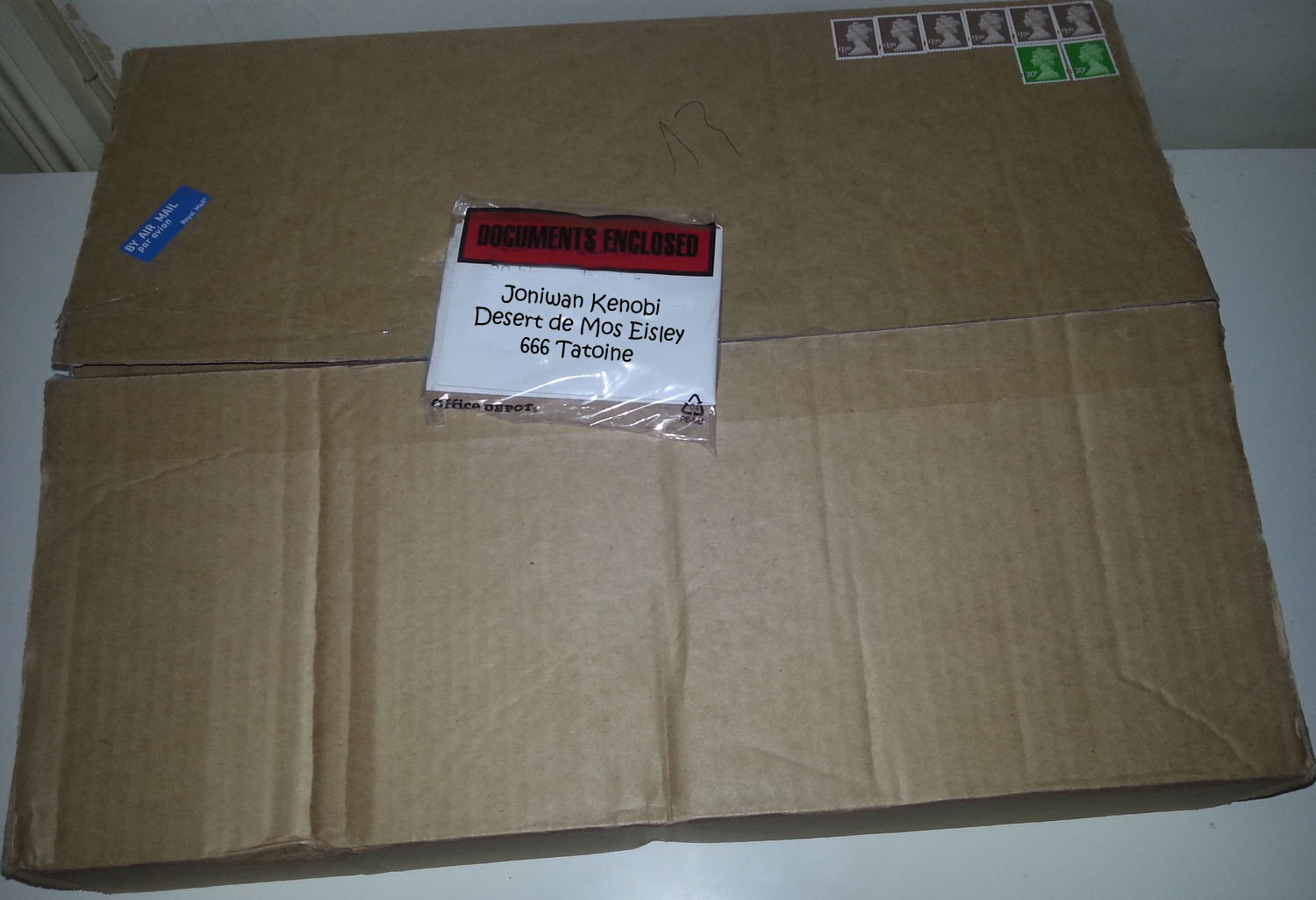 Livrée dans une boite énorme toute moche, toute marron, mais customisée avec mon nom ! Par contre, il n'y a pas le nom du jeu dessus...