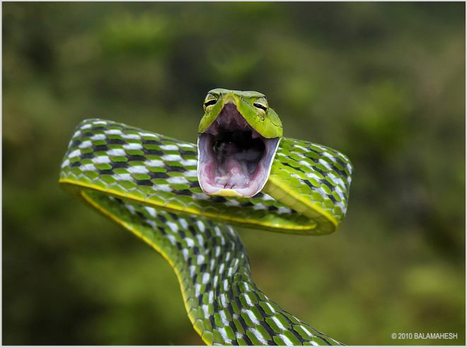Ahaetulla nasuta, un serpent que l'on peut rencontrer en Inde, au Sri-Lanka, en Birmanie, en Thaïlande, au Cambodge et au Viêt Nam :
