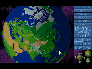 Les autres boutons en bas permettent d'accélérer le temps , ce qui est util voir nécessaire quand on attend que des aliens débarquent. On peut aussi faire tourner et incliner notre planète, ce qui permet de voir toute la terre sous toutes ces coutures (avis à nos géographes amateurs )