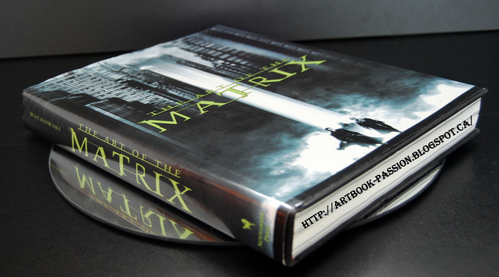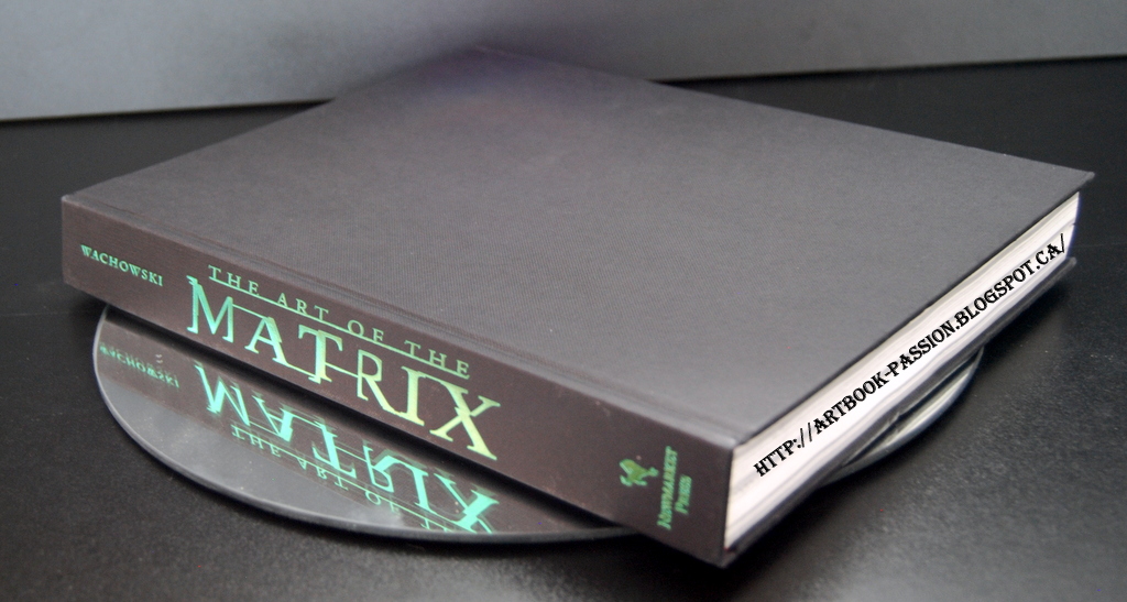 On peut dire que cet artbook envoie du très lourd, il est rare en effet de voir un artbook frôler les 500 pages et ça se ressent avec son poids de 2 kg, je ne vous conseille pas de le lire debout ! La couverture reprend une affiche du film, mais lorsque l'on enlève la protection plastique nous nous retrouvons avec une couverture noire et l'inscription sur la tranche du titre de l'artbook : The Art Of The Matrix en lettre verte du plus bel effet. Pour que ce livre soit parfait, il manque juste sur la couverture quelque lettre verte qui tombe comme dans le film.
