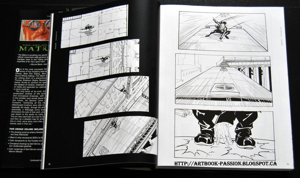 C'est donc parti pour 370 pages de bonheur avec en premier les story-boards en noir et blanc des grands moments du film en suivant la chronologie du film. Le style fait penser à la lecture d'un comics avec les traits dynamique qui colle parfaitement à l'ambiance du film. Lors de la lecture des story-boards, on s'aperçoit qu'ils n'ont pas été dessinés suivant l'ordre de leur apparition dans le film. En effet selon certains passages nous avons un Néo avec des cheveux longs, puis courts, cela parfois à une page de différence. Cela est pareil pour trinity, qui tout comme Néo, a parfois un visage différent faisant même penser à l'héroïne du film Nikita. De même nous aurons aussi la surprise de voir des passages supplémentaires par exemple la poursuite au tout début du film de Trinity par les agents se poursuivre sur un train de banlieue à pleine vitesse, chose totalement absente dans le film.