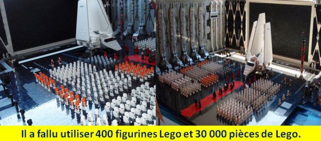 En utilisant 400 mini figures de LEGO et plus de 30 000 pièces Lego, le créateur Jay Hoff a recréé la scène mémorable de l'arrivée de l'empereur de la guerre des étoiles pour le Jour de Découverte de Science à l'École de Berkeley Preparatory dans Tampa.