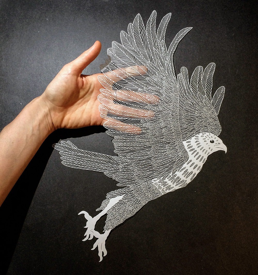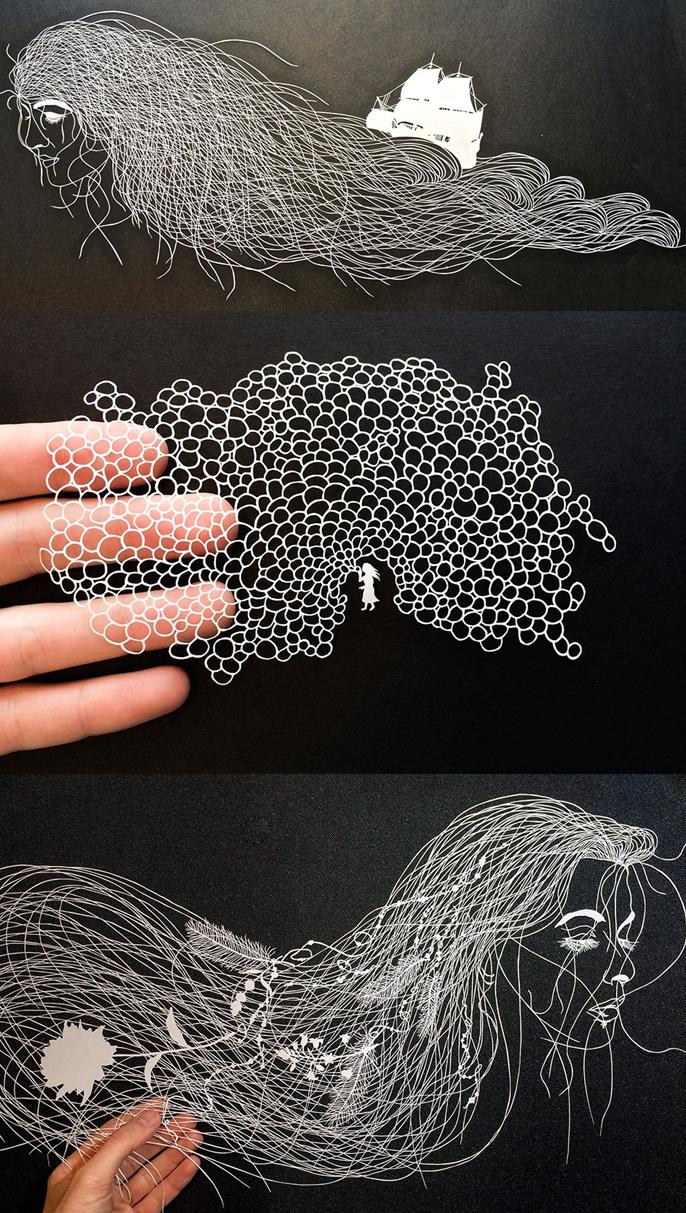 Elle crée des illustrations en découpant du papier d’une façon extrêmement minutieuse et précise.