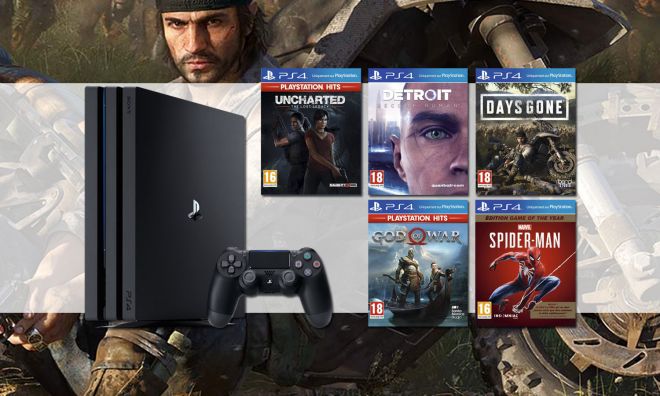 Là voilà la promo PS4 Pro attendue depuis au moins deux ans par les joueurs qui avaient leurs yeux rivés sur la machine de Sony. On retrouve donc ici un bundle des plus intéressants avec de quoi faire, clairement, en termes de jeux. Days Gone est une belle surprise à mes yeux, God of War est l'un des meilleurs titres de la console tout comme Spiderman vendu ici dans sa version GOTY (Game of The Year, contenant tous les DLC à télécharger). Uncharted Lost Legacy n'est pas le meilleur épisode de la série mais il mérite le coup d'oeil. Enfin, Detroit Become Human reste une belle expérience à faire sur PS4.