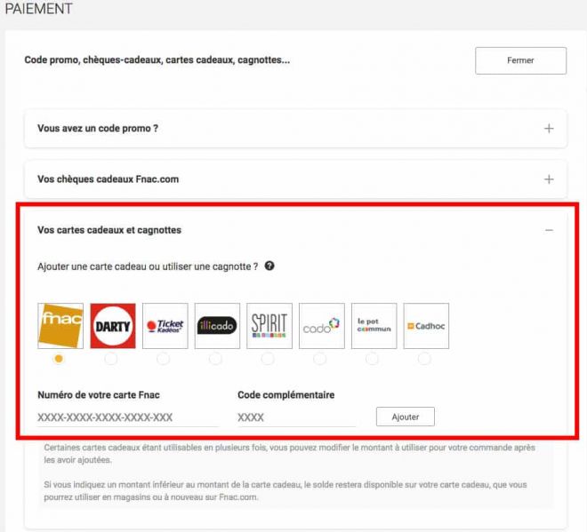 PS : les cartes jackpot sont limitées à 2 de chaque montant. Une fois achetées, elles sont envoyées par mail. Vous devez alors les renseigner en moyen de paiement dans "chèques cadeaux cagnotte comme sur le screenshot ci-dessous). Par ailleurs vous ne pourrez les utiliser qu'en choisissant la livraison à domicile (ou point relais).