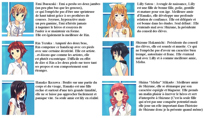 Pour être franc, le jeu est intéressant car les filles sont intéressantes dans une moindre mesure. Je dis dans une moindre mesure, car comme dans tout bon visual novel, vous aurez des personnages que vous apprécierez et d'autres non. Et les histoires sont agréables à suivre. Mais pour ce qui est d'une quelconque réflexion sur un sujet concernant le handicap, c'est limite le néant. En gros, c'est un bon jeu qui fera passer un bon moment à ceux qui aiment les histoires d'amour naissant et pas niaise mais clairement si vous êtes du genre à tilter dés qu'une incohérence pointe le bout de son nez, qu' un détail trop gros à avaler arrive avec ses gros sabots ou que c'est un poil classique et peu original, vous risquez de ne pas aimer.