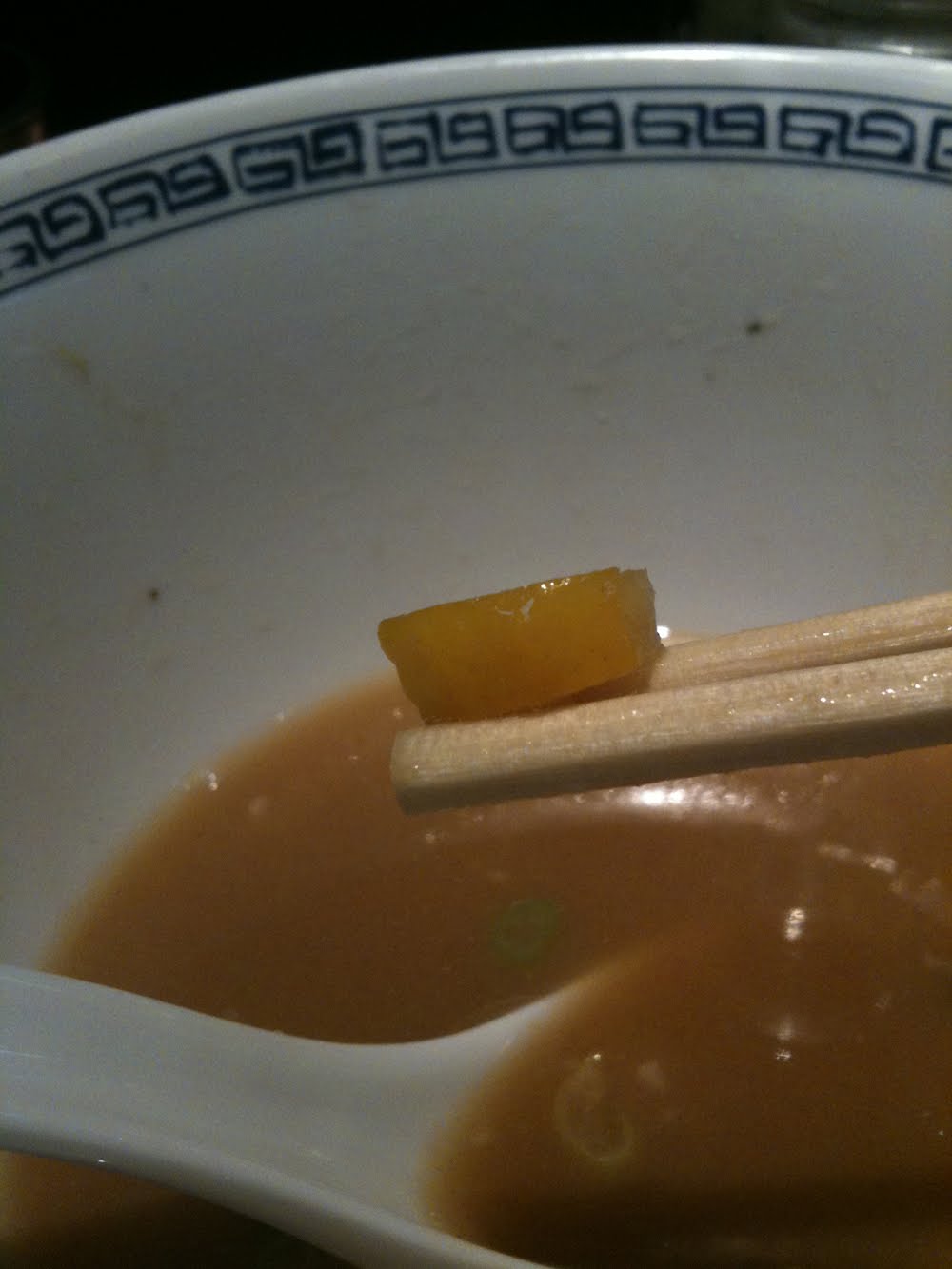 La soupe à base de tonkotsu et de fruits de mer est assez surprenante car très facile à boire pour un tonkotsu (bouillon fait avec les os et gras de porc). Son gout riche est très intelligemment pondéré par une pointe d'acidité avec du Yuzu (agrume Jap).