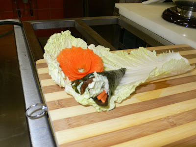 Je n'ai pas de belles photos mais j'ai au moins le travail final de la démonstration des Temakis: agneau teriyaki, radis noir, carotte, choux, riz vinaigré ^o^