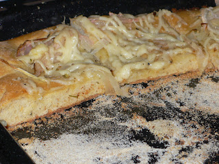 On met de la semoule au fond de la plaque noir du four et on y place grossièrement la pâte, on l'étale tant bien que mal sur toute la surface. La semoule de blé va empêché la pâte de coller au fond et lui donnera ce coté granuleux et croustillant tout en prenant toute l'humidité en trop.