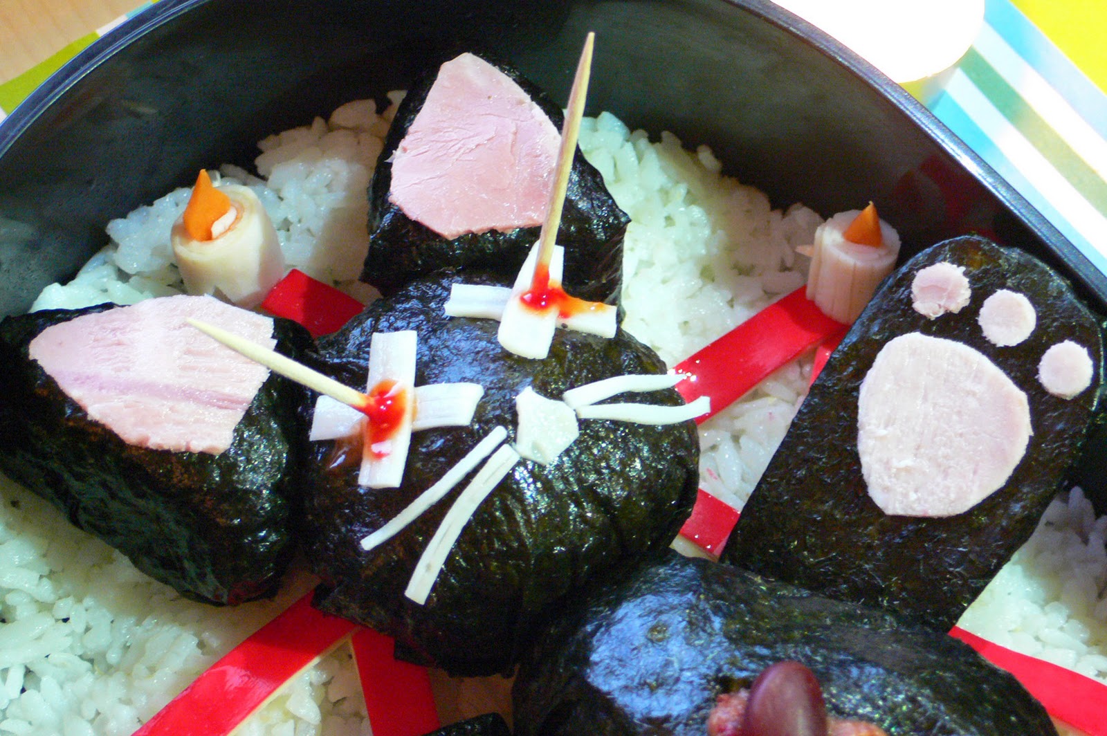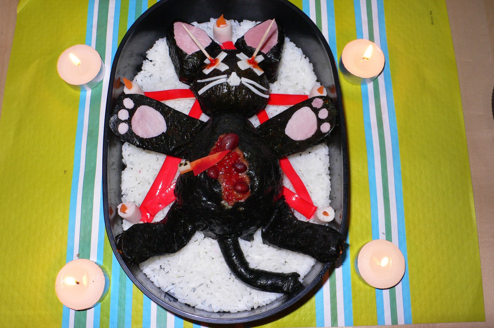 Vous apprécierez mes bougies maison en surimi et carotte, mes onigiris farci au chili con carne maison, les patounettes en jambon et carottes, les petits yeux innocents en fromage ainsi que ce banal pentacle d'invocation ^o^