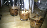 On brise les biscuits dans 4 gros verre, on imbibe ces brisures de biscuit avec du café et un bouchon d'alcool amaretto par verre.