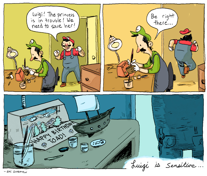 Luigi n'est peut-être pas le plus valeureux des héros, ni le plus téméraire, mais il est bourré de talents cachés, et est très attentionné envers ses amis. Nous le découvrons ici, une fois de plus grâce à Zac Gorman, en pleine préparation d'une belle surprise pour son ami Toad... C'est meugon...
