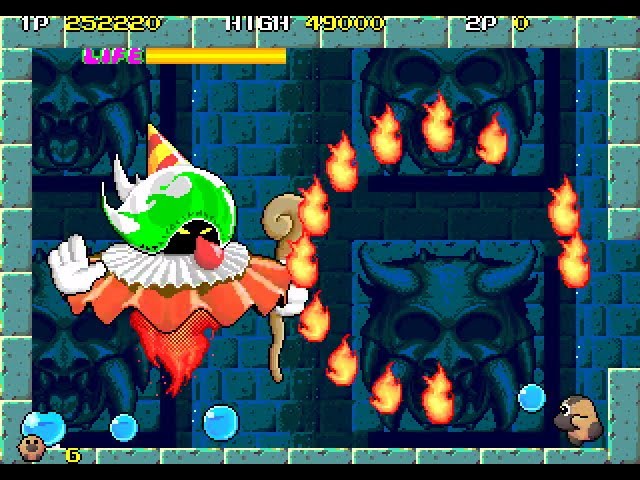 Taito Milestones 2 est donc une compilation qui regroupe 10 jeux historiques de la firme éponyme. Comme pour la première compilation, cette nouvelle anthologie ne va étrangement pas s'appuyer sur les plus grosses gloires de la firme et va plutôt tenter de nous faire découvrir des jeux méconnus. C'est un parti prit intéressant pour qui s'intéresse à l'histoire du jeu vidéo. Pour Bubble Bobble, Rainbow Islands ou Opération Wolf il faudra donc attendre une probable compilation volume 3. Toutefois la selection ne comporte pas que des illustres inconnus comme nous allons le voir, et les autres font partie de l'histoire de la firme. Bon on ne va pas se le cacher, il y a dans le lot quelques titres tout à fait oubliables qui n'ont leur place que dans un contexte historique. Par ordre chronologique voilà la liste des jeux proposés : Ben Bero Beh (1984), The Legend Of Kage (1985), Kiki Kaikai (1986), NewZealand Story (1988), Darius 2 (1989), Gun Frontier (1990), Liquid Kids (1990), Metal Black (1991), Solitary Fighter (1991) et DinoRex (1992). Comme pour le premier volume, les titres les plus connus ne sont pas forcément les meilleurs et tous sont des portages des versions arcade disponibles indépendamment dans la gamme Arcade Archives. Au lancement, un sobre menu permet de choisir son jeu. Après le choix d'un jeu, on bascule sur un écran de rappel des commandes avant d'atterrir sur l'écran titre du jeu. Globalement une pression sur L ajoute des crédits tandis que la touche R sert à utiliser un crédit et lancer le jeu. En appuyant sur + ou -, on arrive sur un gros menu proposant un certain nombre d'options (qui peuvent varier selon les jeux). Globalement, on y trouve un classement en ligne du score (avec les paramètres par défaut), l'accès à une notice, la configuration des touches, les paramètres du jeu (difficulté principalement), les paramètres d'affichage (taille, orientation, fonds d'écrans et filtres) ainsi que la possibilité d'effectuer une sauvegarde temporaire. C'est un peu chiche. Pas de rewind ni même de véritables save states, et aucun contenu bonus comme des artworks, ou un mode jukebox, on reste sur le jeu en lui-même. Les plus assidus remarqueront que ce pavé est identique à celui du test du premier volume pour une raison simple : rien n'a changé sur ce plan-là. A noter que pour certains jeux, il n'est pas possible de continuer la partie en remettant un crédit c'est retour à l'écran titre sans ménagement. Soyez prévenus c'est potentiellement frustrant.