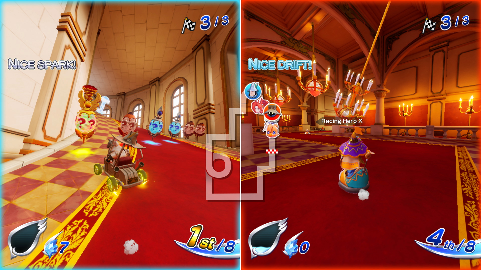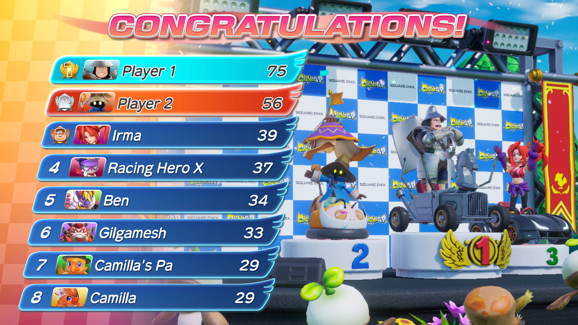 Le mode Chocobo GP donc propose un système assez unique de tournoi à 64 joueurs par pools de 8 joueurs. Il faudra arriver dans les 4 premiers à chaque course pour passer à l'étape suivante jusqu'à la finale à 8 joueurs. Selon votre classement, vous gagnerez donc un certain nombre de points d'expériences qui feront monter votre niveau de saison. A noter que pour débloquer le personnage de Cloud, il faudra monter niveau 60, ce qui requiert beaucoup de courses et un investissement conséquent dans le jeu. Que ce soit dans ce mode ou en mode Multijoueur classique, on note un code réseau irréprochable probablement aidé par l'expertise d'Arika avec Tetris 99. Voilà qui change du lag à gogo des jeux Nintendo (surtout Smash Bros) et qui peut le différencier. Niveau gameplay, le jeu s'inspire très clairement de Mario Kart avec le même système de dérapage, de figues et de démarrage canon. Il propose tout de même des subtilités sur le système d'objets (12 différents). Les oeufs surprises qui les contiennent sur le circuit sont répartis en 3 couleurs : or, Argent et Bronze qui en change la qualité obtenue. Il est possible de stocker 3 objets, mais si deux objets identiques sont obtenus, ils fusionnent pour devenir plus puissants. Et si vous arrivez à obtenir plus de 3 fois le même, à vous la magie ultima surpuissante. A noter que les attaques sont bien plus virulentes que dans Mario kart avec des effets qui pleuvent de partout difficiles à éviter malgré un avertissement à l'écran. Si on rajoute les très nombreux obstacles des circuits, il n'est pas rare de rentrer en collision et de mettre un temps fou pour repartir. A noter que l'IA semble avoir un malin plaisir à vous enchainer ce qui est très frustrant.