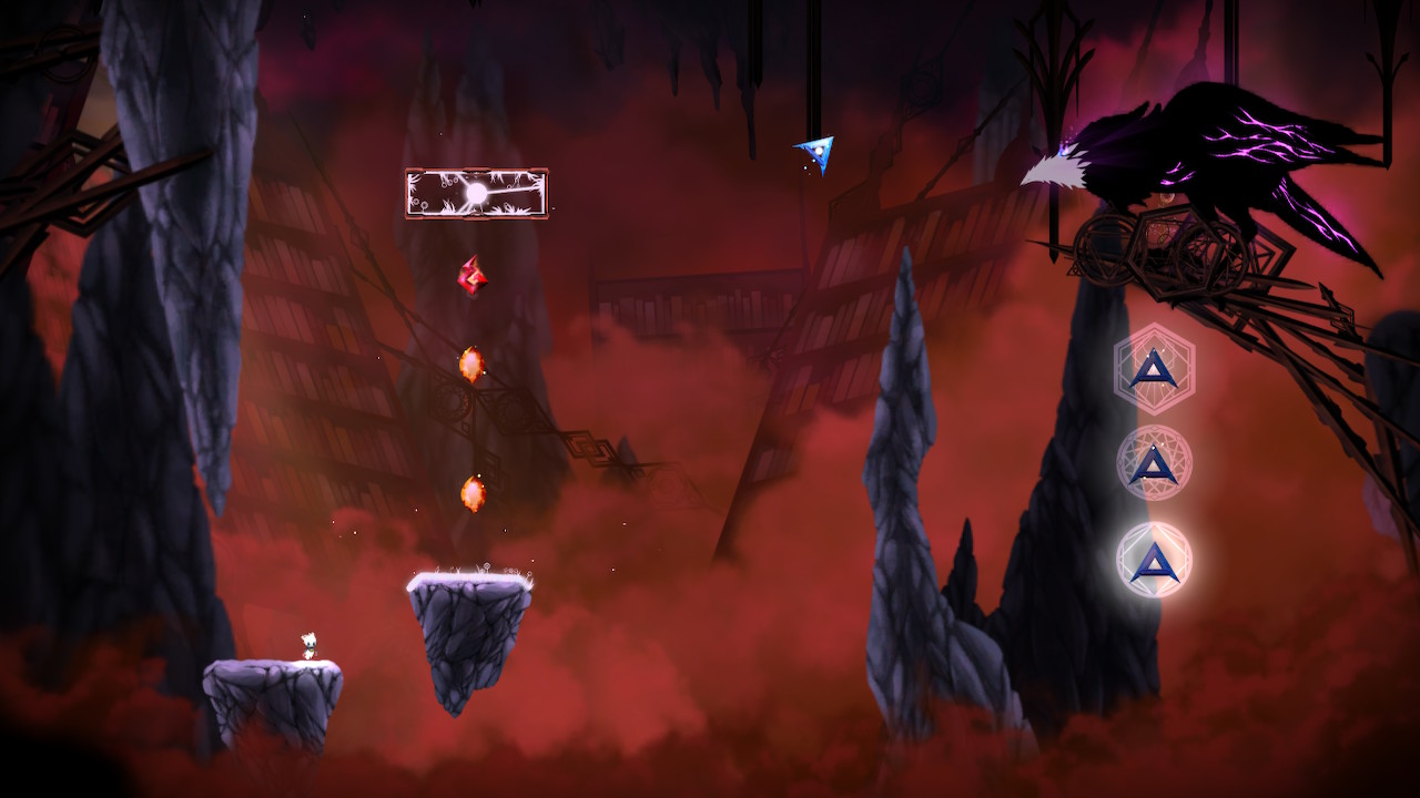 Nous avons déjà parlé de la possibilité des cristaux. Ce n'est pas juste un gimmick, c'est à la base même du gameplay du jeu. En plus de se mouvoir simplement de gauche à droite et de sauter, Ki dispose d'une flamme spirituelle qui lui permet de briser des cristaux pour en extraire le pouvoir. A tout moment, un appuie sur la touche LR ralentie le temps et fait apparaitre une ligne blanche que l'on dirige avec le stick. Si on arrive à aligner notre personnage, un cristal et une paroi blanche ; on valide avec la touche Y, c'est Jackpot le pouvoir est libéré immédiatement. Selon le cristal l'effet sera différent. Les gemmes jaunes permettent de propulser KI dans la direction opposée, les feuilles vertes de créer une plateforme, les boules violettes de générer une zone antigravité... Plus amusant encore, il est possible d'avoir plusieurs cristaux dans le même alignement, auquel cas leurs effets se cumulent. Mais attention, chaque cristal ne peut être brisé qu'une seule fois. Il faudra donc bien réfléchir à l'ordre dans lequel il conviendra de les détruire et de quelle manière. En cas d'erreur, pas de rewind, mais la possibilité en laissant appuyé une bonne seconde sur la touche X de réinitialiser le niveau. Pas de temps de chargement c'est instantané. Ouf ! L'équilibrage du jeu est très réussi en évitant que le sentiment de frustration ne l'emporte sur le reste. Il faut réfléchir, mais rie qui n'est insurmontable au bout d'un certain nombre d'essais. Evidemment tout dépendra également de votre adresse et de votre sens du timing, car la composante plateforme du jeu n'est pas à négliger.