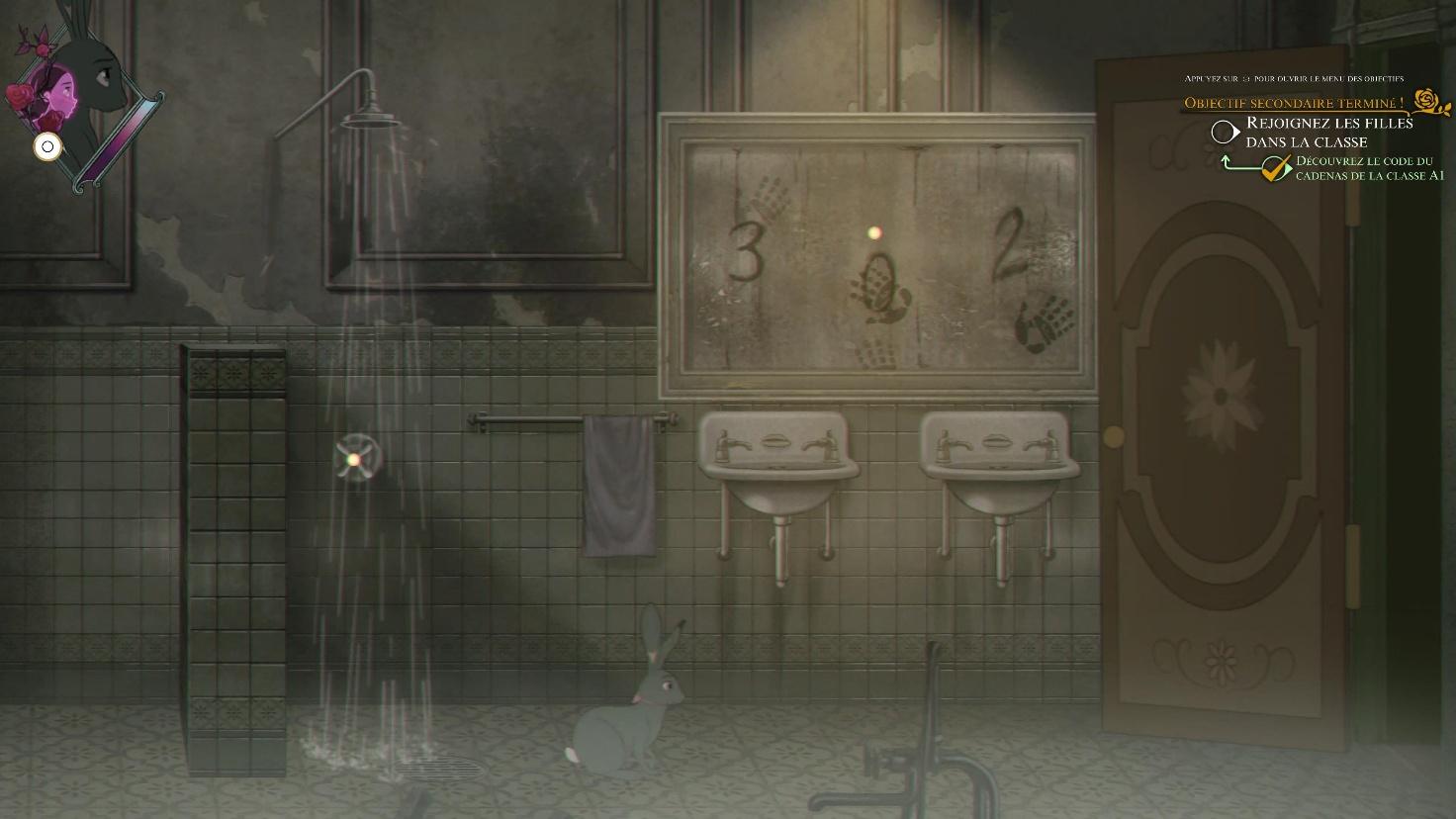 Venons-en au gameplay. Globalement, Bye Sweet Carole est un jeu d’aventure 2D narratif dans lequel vous explorerez votre environnement, trouverez des objets pour résoudre des énigmes et devrez parfois vous cacher pour échapper au danger. Le jeu évoque par certains aspects le premier Clock Tower (pour ceux qui s’en souviennent), mais avec une réalisation bien plus moderne. Lana peut se déplacer, inspecter l’environnement, déplacer ou utiliser des éléments et gérer un inventaire d’objets (certains pouvant être combinés). Rapidement, elle obtiendra une étrange faculté : se transformer en lapin, ce qui lui permettra de se faufiler dans des espaces étroits ou de rebondir sur des murs pour atteindre des zones plus hautes. Les nouvelles mécaniques sont introduites progressivement dans des zones tutoriels discrètes, et à aucun moment on ne se sent bloqué par un gameplay trop exigeant — un bon point.