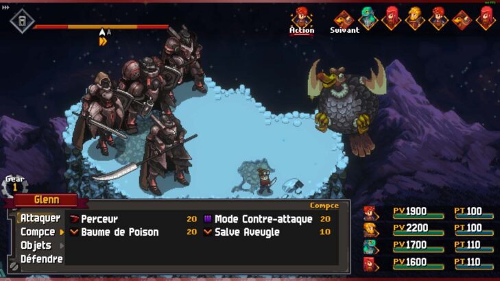 Si Chained Echoes sait reprendre à son compte bon nombre d'éléments venus des plus grands jeux du genre (on peut citer les recrues de sa base à trouver comme dans Suikoden), il sait aussi proposer son lot d'innovations. Les combats au tour par tour par exemple proposent un système unique et stratégique. Tout d'abord, seuls 4 personnages peuvent prendre part au combat, mais chaque personnage peut avoir un autre personnage réserviste lié. Il est possible au tour du personnage en question de passer en réserve et de se faire remplacer. Avec une bonne formation il est ainsi possible de créer des synergies ou d'adapter sa stratégie à la volée selon les besoins. D'ailleurs un certain nombre de compétences dévoilent leur potentiel dans certaines conditions. Par exemple, Sienna dispose d'une attaque qui démultiplie les dégâts si la cible est paralysée. Or Robb dispose justement d'une attaque spéciale qui paralyse. Le système des effets de statuts est aussi unique, car si une cible en est affublée d'un, il faudra alors lui appliquer deux fois supplémentaires pour lui appliquer le même statut de nouveau (puis 3 fois, puis 4...). Ainsi donc, il faudra bien réfléchir au meilleur moment d'appliquer un silence ou une inaction au risque sinon de ne pas pouvoir le faire au moment opportun. Un élément central des combats est la jauge d'overdrive. En haut à gauche de l'écran, une jauge monte à chaque action. Quand elle est dans l'orange rien ne se passe. Dans le vert elle augmente vos statistiques et dans le rouge elle les diminue. Il faudra alors veiller à rester au maximum dans le vers et éviter comme la peste le rouge. Pour gérer la progression, la barre indique un type de capacité. L'usage d'une capacité de ce type baissera alors la jauge. A défaut, se défendre est également une option, de même que l'usage de certains objets spéciaux. Comme si ce système ne suffisait pas, le jeu propose à partir d'un certain point d'utiliser des armures célestes (en gros des méchas), utilisables pour l'exploration (on y reviendra), mais également dans des combats ce qui a pour effet d'en changer drastiquement les règles. Dans cette configuration, plus de système de réservistes, et les armures disposent de leur propre équipement et attaques spéciales indépendamment des pilotes. Le système d'overdrive est également différent. Chaque armure dispose d'une boite de vitesse qui passe de 0 à 1 puis à 2 avant de revenir à 0 et ainsi de suite. Chaque vitesse a ses propres avantages et inconvénients et doit donc être adaptée en fonction de la situation. En vitesse 1 (de base) les attaquent font monter la jauge. En vitesse 2, les dégâts infligés et reçus sont augmentés ainsi que le cout en point de technique (points de magie) des compétences, mais la jauge d'overdrive descend. Enfin en vitesse 0 la jauge ne bouge pas, il est impossible d'utiliser des techniques mais les attaques redonnent des points de technique. Bref le système est riche et permet de nombreuses stratégies. Dans tous les cas le jeu est généralement d'un incroyable justesse dans sa courbe de difficulté.