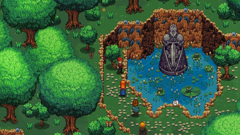 Si les combats prennent une place importante dans le jeu, l'exploration est également proéminente. Le jeu sait ainsi toujours garder la ligne de crête entre le dirigisme et la liberté. Chaque partie du monde regorge de petits secrets à trouver. Des coffres enterrés, des grottes secrètes, des monstres uniques à dénicher et occire pour la guilde, des statues de dieux qui apportent une nouvelle classe à équiper, et des recrues potentielles pour la base d'opération ne sont que quelques exemples des choses à faire. La linéarité du début de jeu laisse progressivement place à plus de liberté dès lors qu'on met la main sur un vaisseau volant permettant de se déplacer sur une carte du ciel à la manière d'un Secret Of Mana. Plus tard encore, les fameuses armures célestes permettront de s'envoler en passer par-dessus les obstacles des lieux. Bref, l'exploration du jeu se fait par couches successives et ainsi à revenir régulièrement dans des lieux déjà explorés pour en découvrir tous les aspects. Pour mieux garder la trace de ce qu'il reste à trouver, une grille des récompenses est disponible listant un certain nombre d'actions à effectuer pour tamponner la case, sachant qu'une chaine de cases validées apporte des bonus en fonction de sa taille. Niveau progression, les personnages de Chained Echoes ne disposent pas de niveau et de points d'expériences. Pour progresser, il faudra dans un premier temps trouver des éclats de grimoire qui permettent d'apprendre une compétence active ou passive (à équiper en nombre limité) ou de monter certaines statistiques. A force de remporter des combats, les techniques équipées peuvent être montée jusqu'au niveau 3 pour en renforcer les effets. Evidement la progression se fait beaucoup par l'équipement, d'autant plus que les armes et armures peuvent être améliorées chez le forgeron puis incrustées de gemmes ayants divers effets, ce qui rajoute une couche de stratégie.
