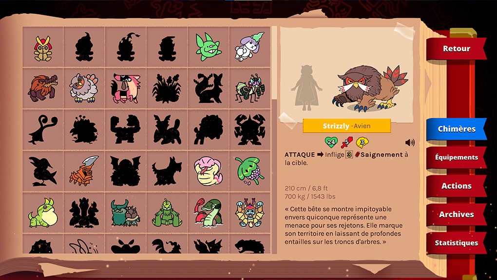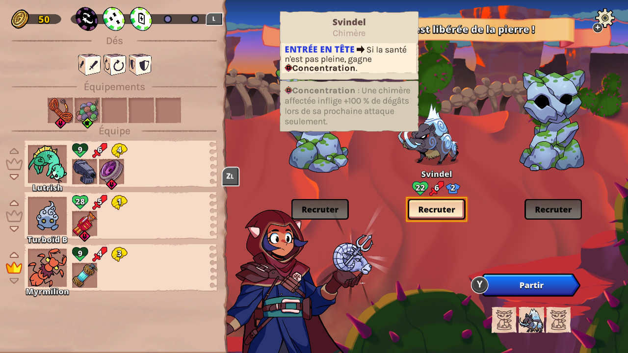 Que vous gagniez une partie ou non, un score est calculé en fonction des résultats. Grand classique du genre, ce score est l'occasion de débloquer petit à petit de nouveaux éléments. En premier lieu, de nouveaux types d'évènements pour pimenter les parties comme des choix reliques maudites (impossibles à enlever) ou friables (qui sont détruites lorsque le porteur est KO). On trouvera aussi des reliques spéciales qui donnent un énorme malus lors du prochain combat, mais apporte un gros bonus au porteur s'il survit à la mêlée. En dehors des évènements, on débloque aussi par palier de nouvelles chimères ainsi que de nouvelles reliques, ce qui permet de relancer un peu l'intérêt, mais aussi d'apporter de nouvelles possibilités pour survivre au mode épreuve. Ce mode est similaire à ce qu'on trouve sur un Slay the Spire ou sur Monster Train. A chaque niveau d'épreuve, on rajoute à la fois des contraintes et des bonus pour jouer selon des règles un peu différentes. A titre d'exemple le niveau 2 vous donne la possibilité de relancer tous les dés inutilisés une fois par tour, mais en contrepartie donne un dé supplémentaire aux ennemis.