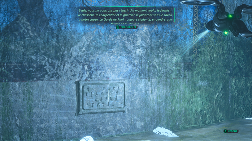 Je continue le chemin. On m’a dit de suivre les clochettes mais le chemin se divise en deux et je prends le mauvais chemin, faisant exprès de me perdre. Je tombe sur des ruines et trouve une cloche calcinée, un objet de recherche. Mon goût pour l’exploration s’en trouve récompensé, ce sera une constante sur tout le jeu. Je rencontre ensuite un deuxième personnage qui me demande d'aller chercher un objet à l'Ouest d'ici, et me donne une boussole. Un peu plus tard, après avoir résolu un code pour ouvrir la porte d’un donjon, j’y rencontre mon premier ennemi. Je suis impuissant, mais surgit un personnage inconnu pour me sauver, perdant la vie tout en tuant notre ennemi. Mon personnage ne perd pas de temps et récupère la tenue de cette héroïne défunte, son arme et son drone aussi. Apparemment mon personnage est opportuniste et insensible. J’explore les salles suivantes et dès que je rencontre un monstre, je le tue assez facilement avec l’épée et avec l'aide de mon drone qui le distrait. Drone qui me sert aussi pour illuminer ou pour scanner et traduire des panneaux qui comportent une langue inconnue. Très utile car face à une porte fermée, c’est en lisant les textes dans les salles environnantes que je trouve le code pour ouvrir cette porte. Et tout ceci en quelques minutes, mon personnage apprend très très vite.
