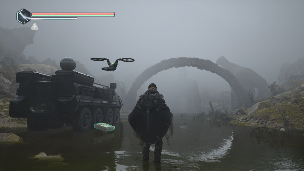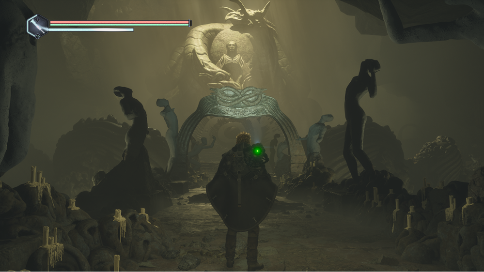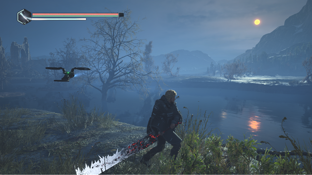 Et dans ce dédale de chemins, ce sont les monstres qui deviennent eux-mêmes un repère : s’ils ne sont plus là, c’est probablement que l’on a déjà exploré ce coin. Les monstres ne sont finalement que des marqueurs d’exploration, presque accessoires! Mais le jeu n’assume pas vraiment cette facilité des combats car il y a beaucoup de mécaniques de jeu autour de ceux-ci. Et elles se sont d’ailleurs révélées inutiles sur ma partie. J’ai pu finir le jeu au niveau de difficulté intermédiaire en bénéficiant presque uniquement de la régénération de santé fournie par une relique après chaque combat. Je n’ai pas eu besoin d’utiliser ni les glyphes (pouvoirs spéciaux de mes armes), ni les pouvoirs du drone, ni de chercher à faire des parades, des esquives ou des régénérations de santé en appuyant sur R1 au bon moment, ni d’aucun item consommable! Et chez le forgeron, je n’ai eu besoin que d’augmenter de niveau une grosse épée niveau 3, trouvée dans le premier quart du jeu, et qui m’a servi jusqu’à la fin. Toutes les autres capacités du forgeron m’ont été inutiles. L’intégration de toutes ces mécaniques dans la courbe de difficulté n’est pas exploitée à fond. Au contraire, j’ai ressenti un grand pic de difficulté avec deux boss, originaux et magnifiques, que je n’ai pu battre qu’en repassant en mode facile.