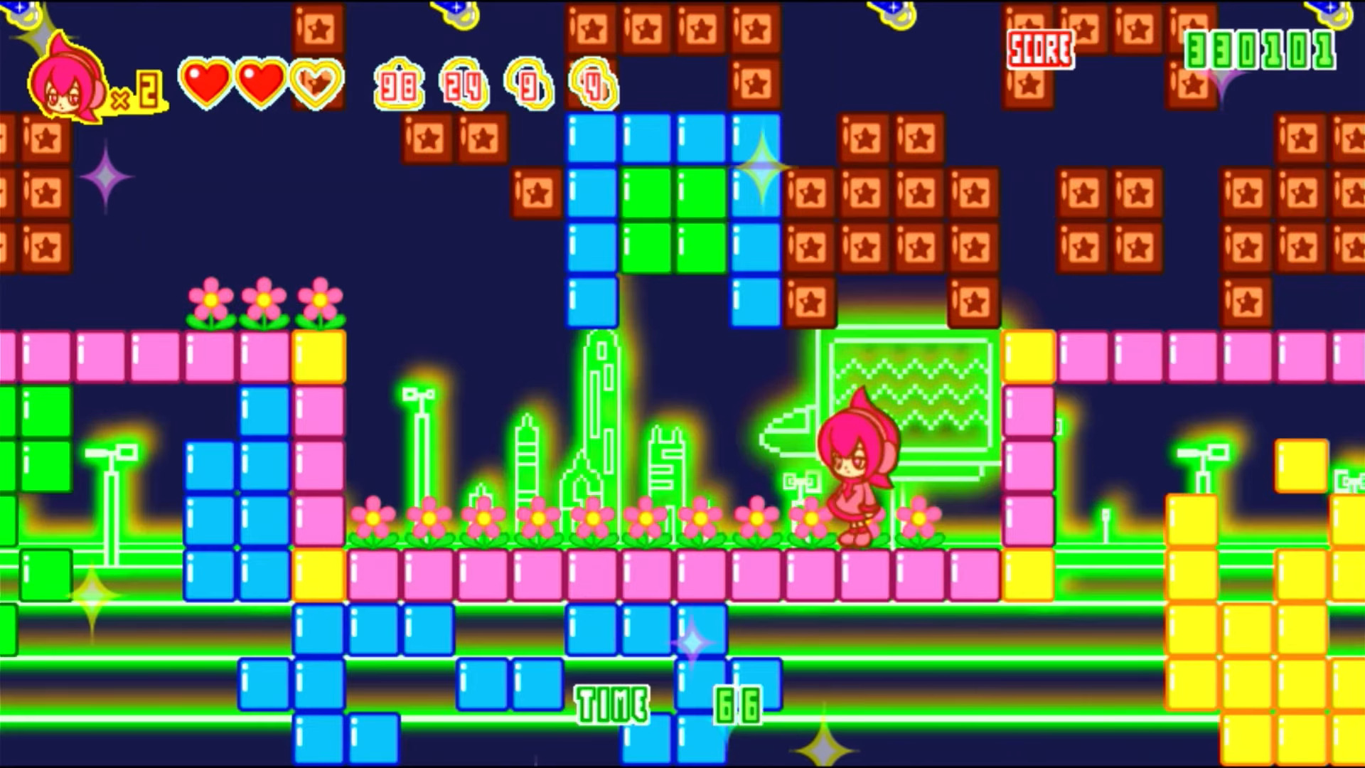 Manette en main, Nico se dirige plutôt bien, surtout en mode de contrôle par défaut (original + extra). Un bouton sert à sauter, et un pour attaquer à coup de parapluie. Laisser appuyer sur le bouton d'attaque en l'air déploye le parapluie pour planer. Bas + attaque en l'air permet de foncer vers le sol dans une attaque foudroyante. Laisser appuyer sur la touche d'attaque contre un mur permets de s'y accrocher, puis de se propulser dans une direction apposée au mouvement (un peu perturbant au début ce mouvement devient vite une habitude). Deux autres mouvements existent : Le parapluie fusée (attaque et saut simultanément) permet de lancer son parapluie horizontalement (ce qui récupère au passage les bonus et permets de se téléporter ensuite vers un mur). L'uppercut de pistolet (Bas + attaque répétée au sol) pour sa part envoie un ennemi en l'air avant de le cribler de balles. Le type de contrôles définit la manière de lancer ces attaques : soit comme sur arcade avec une combinaison de touches, soit avec des touches de tranches dédiées, soit les deux sont possibles. Enfin, laisser appuyer au sol sur le bouton d'attaque permet de déployer son parasol et de passer en mode défense. Avec le stick (ou la croix), on peut ainsi définir une direction de protection. Tout tir ennemi en étoile lui est alors immédiatement renvoyé dans la figure. Le jeu est assez riche en possibilités tout en restant agréable à manier. Le système de scoring est lui aussi assez riche. Outre trois gammes de gemmes de couleurs différentes à récupérer dans chaque niveau (les avoir tous donne un bonus de perfect), chaque dalle du sol sur laquelle vous marchez fait pousser des fleurs, chaque ennemi battu donne des points, d'autant plus si c'est en effectuant un enchainement. Le temps restant donne lui aussi un rab de points. Bref si cet aspect-là vous intéresse il y a moyen de bien creuser.